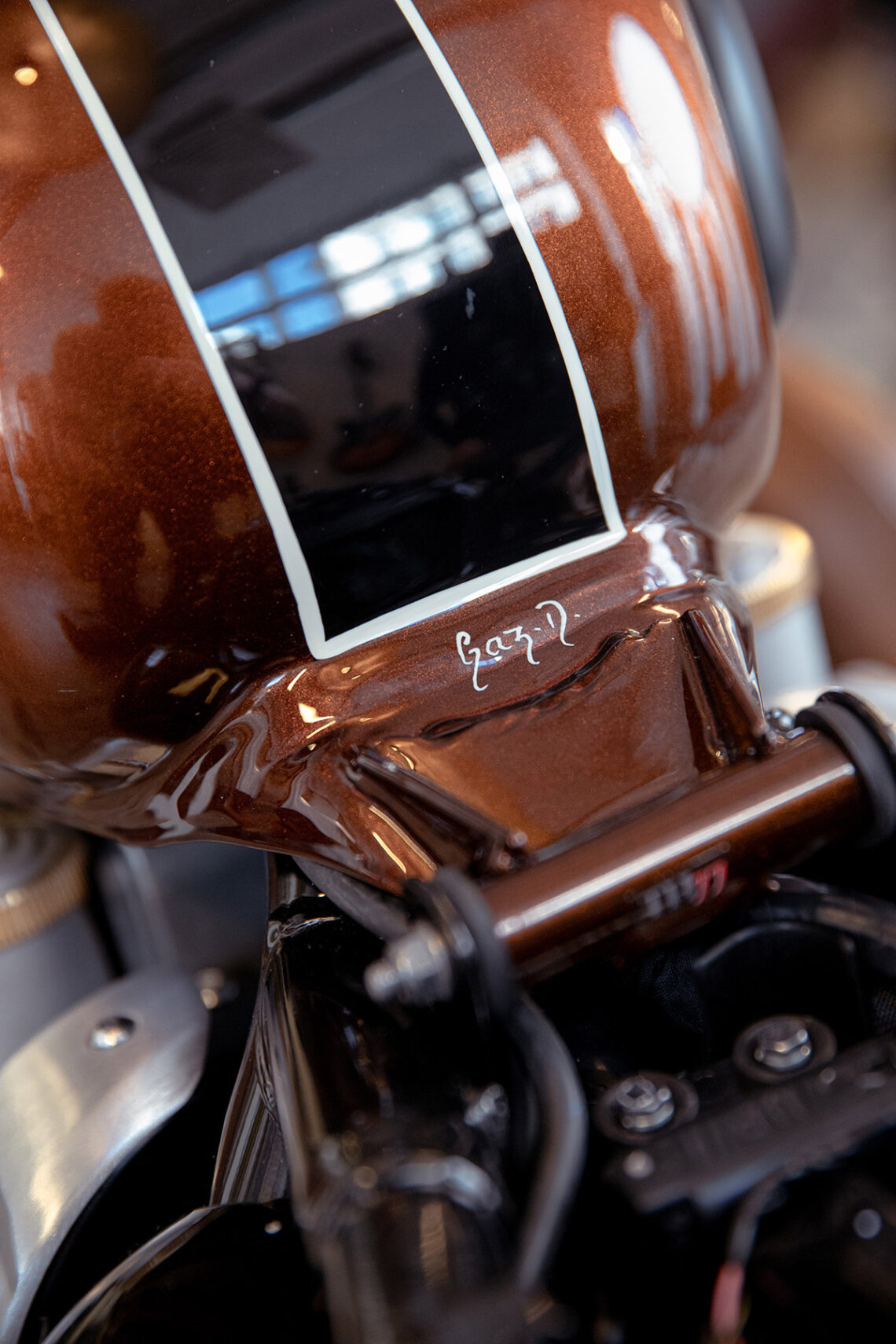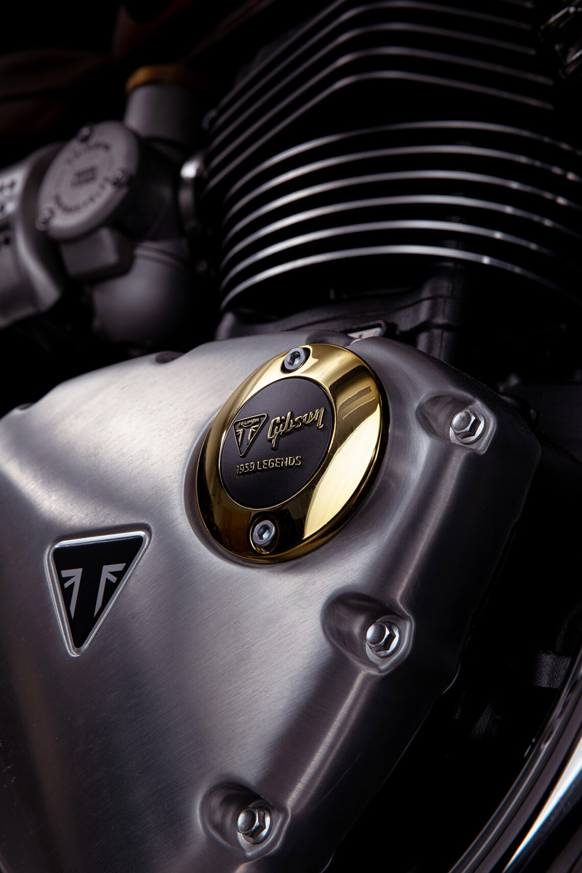 - El depósito, los paneles laterales y el guardabarros frontal lucen el emblema de «Triumph Gibson 1959 Legends» en un sutil dorado metálico electroformado.