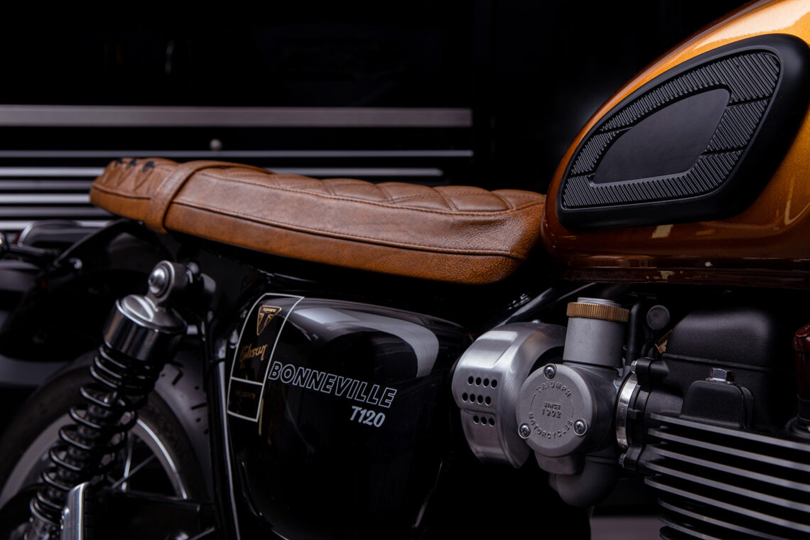 - Sillín custom de auténtico cuero marrón a juego con la funda de la guitarra de cuero, con detalles como costuras en rombo, logotipo bordado de Triumph y compartimentos custom para las púas.