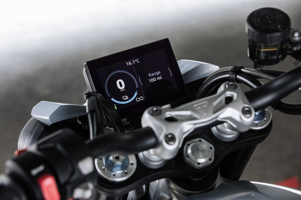 Los mapas de entrega de potencia y par se han diseñado a partir de la Triumph Speed Triple 1200 RS y, según las pruebas realizadas con el prototipo en pista, se confirma una facilidad de manejo similar a la ya vista en los modelos más deportivos de la gama roadster de Triumph con motores tricilíndricos. Por lo demás, se percibe una conducción suave, sin sorpresas, con agilidad y una potencia controlable que transmite confianza y permite divertirte. La configuración de su comportamiento se ha realizado alrededor de 4 modos de conducción, que gestionan la entrega de potencia, el control de tracción y el anti-wheelie. Además, también se puede regular la frenada regenerativa y cuenta con unos modos hacia delante y marcha atrás para facilitar el manejo y la maniobrabilidad en parado.
