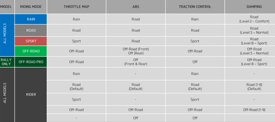La familia Rally se diferencia de las GT por un mayor enfoque aventurero, traducido en la adopción de un chasis de acero con geometrías diferentes, llantas de radios tubeless Akront (delantera de 21 pulgadas), 22 cm de recorrido de suspensión, barras de horquilla doradas, mayor distancia asiento-suelo (regulable, 87.5-89.5 cm), neumáticos Metzeler Karoo Street, modo de conducción Off-Road Pro (permite desconectar totalmente ABS/TC) y puntera de pedal de freno dentado más robusto.