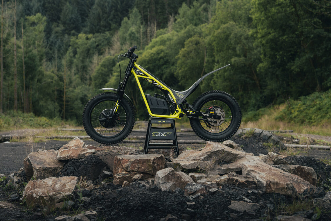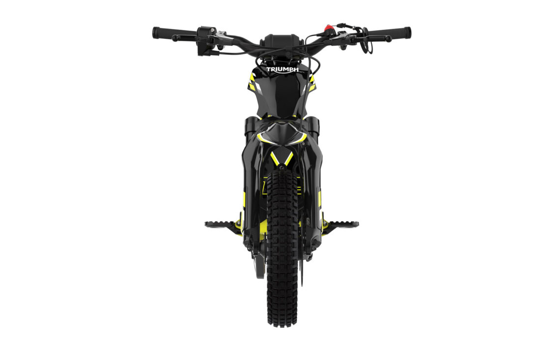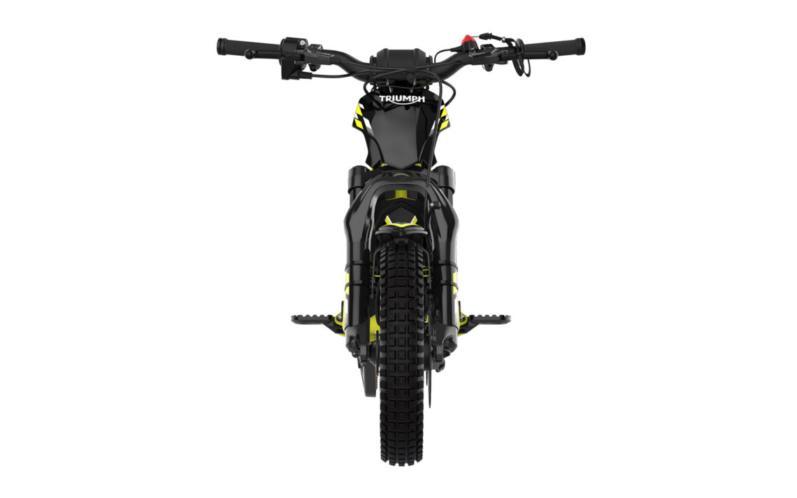 La Triumph TXP-12 está diseñada para atraer a los más pequeños. Tiene un ligero cuadro de acero que le permite tener un peso total de sólo 22,7 kg ( configuración de Trial), por lo que es muy fácil levantar la moto y maniobrar. La altura del asiento es de sólo 360 mm en modo Trial y 445 mm en modo Xplore, lo cual permite a los niños apoyar los pies en el suelo muy fácilmente. Los puños son de talla infantil y las manetas con recorrido corto. Ofrece una distancia entre ejes de 675 mm, una distancia libre al suelo de 152 mm y un manillar de 650 mm.