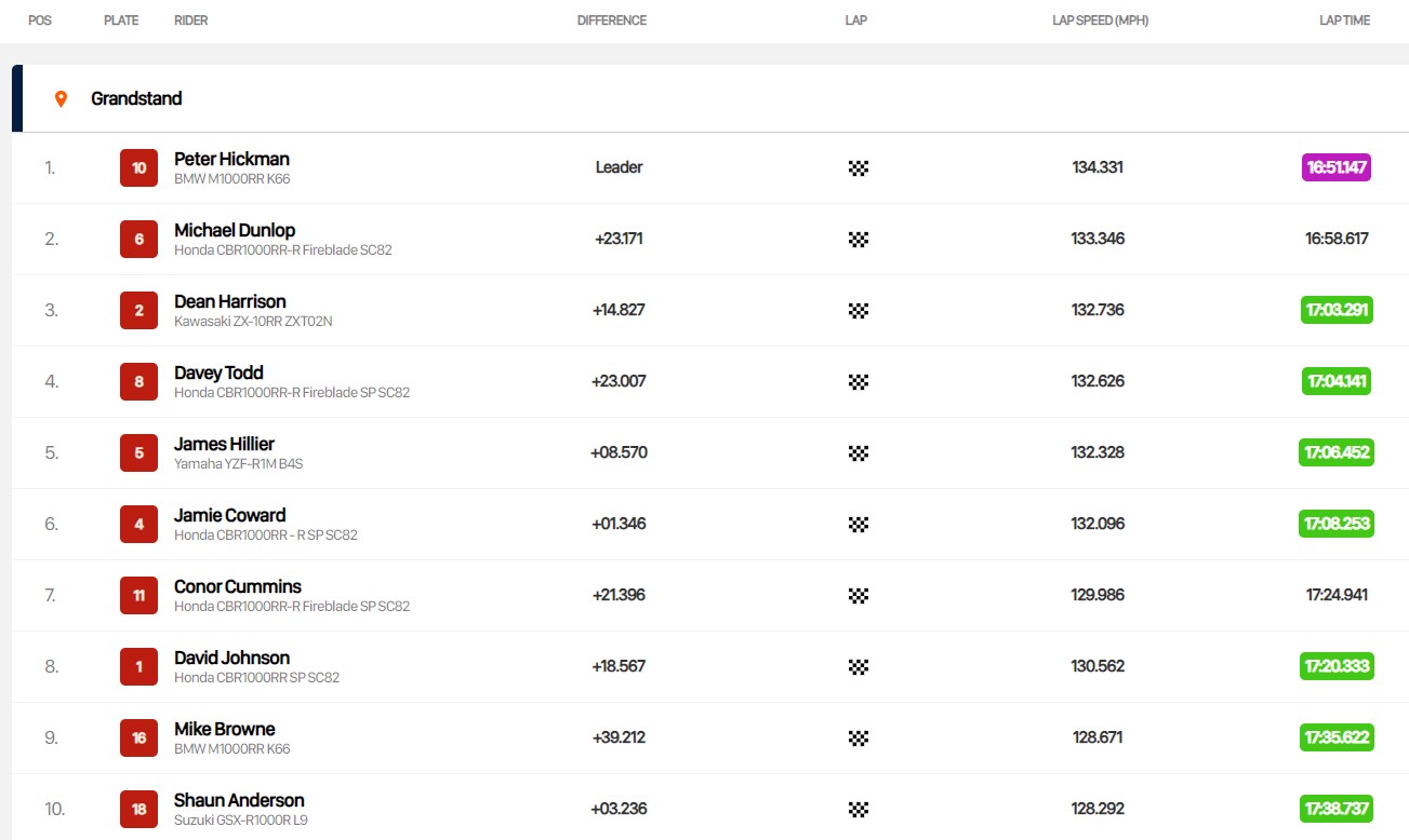 El británico marcó la diferencia sobre su BMW M 1000 RR desde la primera de las tres vueltas de la carrera, en la que ya rozó las 134 mph de media. Tras la parada en boxes y teniendo que desembarazarse de algunos rivales, en la segunda amasó aún más ventaja sobre Dunlop, y en la tercera y última se sacó de la manga una vuelta en 134.331 mph de media para asegurar su primera victoria en el IOMTT 2023 con más de 23 segundos de ventaja.