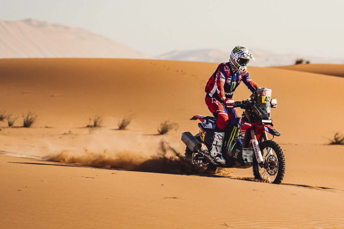 Adrien Van Beveren no perdonó tampoco en este segundo día de sexta etapa, íntegramente sobre dunas. El piloto francés de Honda dominó y se marchó hasta aumentar considerablemente su ventaja respecto a sus perseguidores. De hecho, ayer ganó con una ventaja de 1’21’’ sobre su compañero Ricky Brabec, siendo al término de esta sexta etapa de 4'13" sobre Toby Price, segundo. Tercero finalizó Ricky Brabec a 5'02" del francés. El estadounidense sigue defendiendo el liderato de la general que logró ayer.