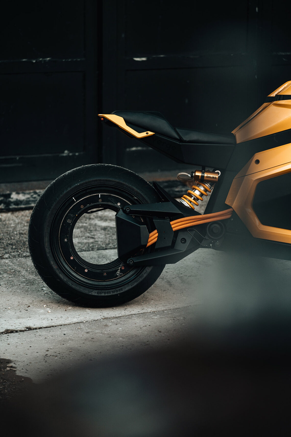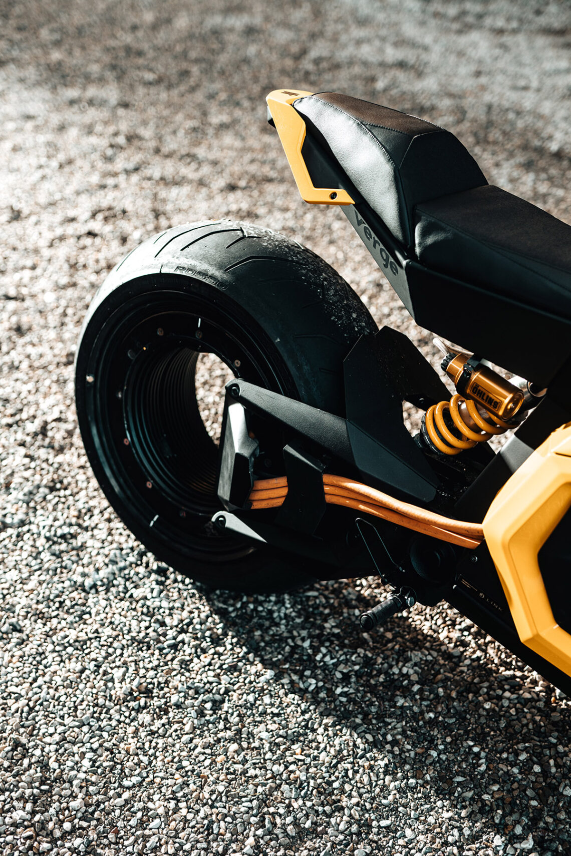 Más allá de sus cifras, que no están nada mal, seguro que los ojos se te han ido a la parte trasera de la Verge TS, que sorprende con una rueda 'sin eje', denominada orbital o tipo Sbarro. Es en ese conjunto trasero donde se posiciona el motor eléctrico, dentro de la llanta, distribuido por el espacio que queda entre el neumático y la llanta.
