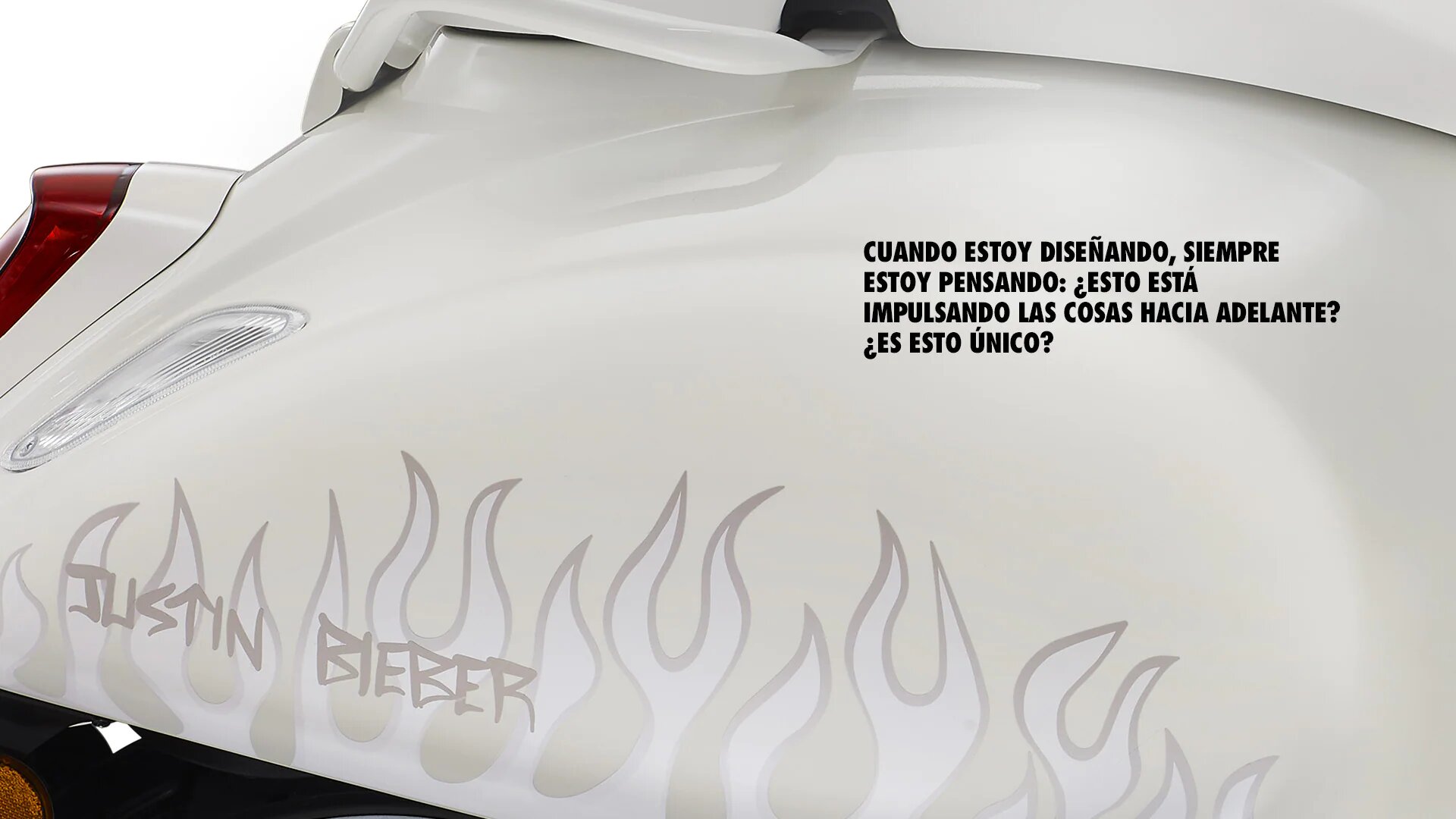 «La primera vez que monté en una Vespa fue en algún lugar de Europa, probablemente en Londres o en París. Recuerdo que vi una Vespa y me dije: 'Quiero montar en una de esas'. Y me lo pasé muy bien, sólo el viento volando por mi pelo, la libertad. Fue divertido», comenta el propio Justin Bieber. «Me encanta Vespa, y asociarme con una marca tan clásica es genial. Ser capaz de expresarme, ya sea a través del arte, la música, los efectos visuales o la estética, ser capaz de crear algo de la nada, es una parte de mí. En última instancia, el objetivo de la creación y el diseño es siempre dar un giro único a las cosas».