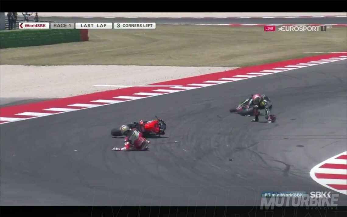 Chaz Davies y Jonathan Rea han vuelto a ser los favoritos a la victoria en la primera carrera de la cita de Misano. El piloto de Ducati y el actual campeón se disputaban la victoria en la última vuelta cuando Davies, líder en aquel momento, caía delante de Rea sin que este pudiera evitar golpear el cuerpo de su compatriota británico.