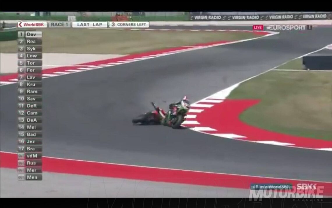 Tres vueltas restaban para el término de la 14° carrera del año cuando un accidente entre los dos pilotos más rápidos del Mundial de Superbike enmudecía a los espectadores. Chaz Davies y Jonathan Rea afrontaban el último sector de la primera carrera en el Circuito Marco Simoncelli separados por escasas décimas. A falta de tres curvas, Davies se iba al suelo y Rea, que no podía esquivar al piloto de Ducati, pasaba la rueda delantera de su Kawasaki por encima de su compatriota británico. El actual líder podría reanudar la marcha y conseguir su podio número 100 en la categoría. El tercer clasificado, aunque se levantó en un primer momento, no.
