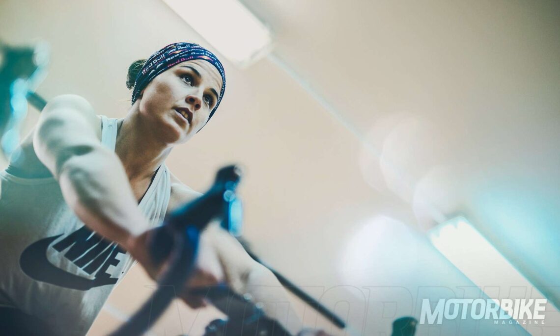 De hecho, es el gimnasio otro de los lugares que más ha visitado la deportista de Corberá. Aquí, Laia Sanz ha podido realizar sesiones de entrenamiento de calidad, es decir, sesiones no muy largas (60-70 minutos), pero muy intensas con poca recuperación entre ejercicios y muy alta en pulsaciones. En moto trabajas todo el cuerpo, por lo que no puedes centrarte en ejercitar sólo una parte. Uno de los ejercicios que más nos ha llamado la atención es lo que Laia Sanz llama 'El Espantapájaros', que consiste en pegar pequeños saltos mientras levantas pesas al frente y arriba alternativamente. Laia explica que lo practica desde que hacía trial y le parece muy práctico porque involucra los brazos, la espalda, los brazos...