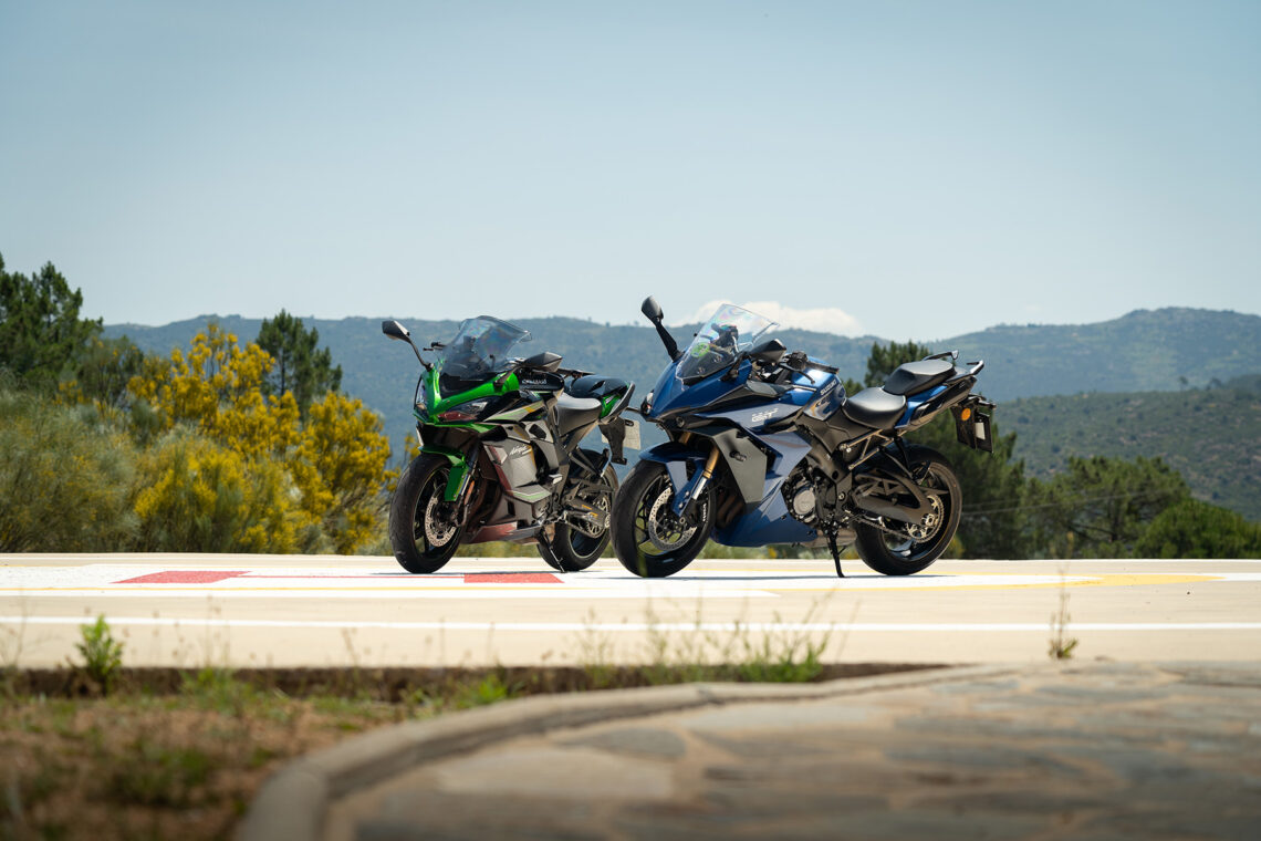 Te compartimos el vídeo de nuestra comparativa en YouTube donde enfrentamos a los pesos pesados japoneses del ámbito sport-turismo, a nuestra izquierda, con carenado verde, 235 kg y 142 cv, el azote de Akashi, la Kawasaki Ninja 1000SX. En la otra "esquina" del helipuerto, con carenado azul, 226 kg y 152 cv, el trueno de Hamamatsu, la Suzuki GSX-S1000GT, ambas del 2023.