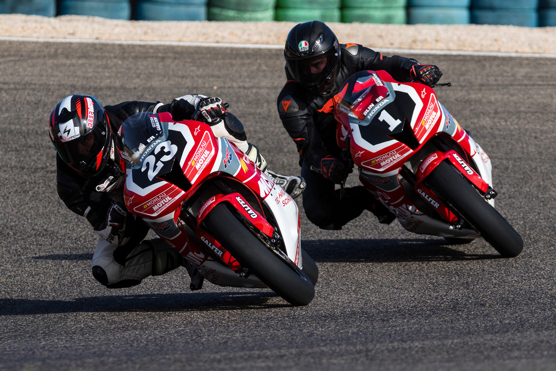 Pero no queda ahí la cosa, resulta que Óscar Pena también fue un consolidado probador de Motociclismo durante muchos años, y él y Romero fueron los representantes de España en el Masterbike durante años, que para más inri se realizaba siempre en Calafat. Osea, además de ser leyendas sobre ruedas, también se conocían el circuito mejor que el pasillo de su casa. De la sección de "pilotos pros" mejor ni hablamos; Oriol Fernández (campeón de España), Kev Coghlan (campeón de España, campeón de Europa supersport, piloto del Mundial de Supersport y Superstock 1000) ó Jacopo Cretaro (piloto del mundial de Supersport y Superbike, así como del FIM EWC, poca broma...), Raúl Jara (ex-piloto del mundial...) entre otros.