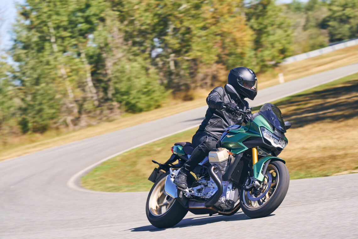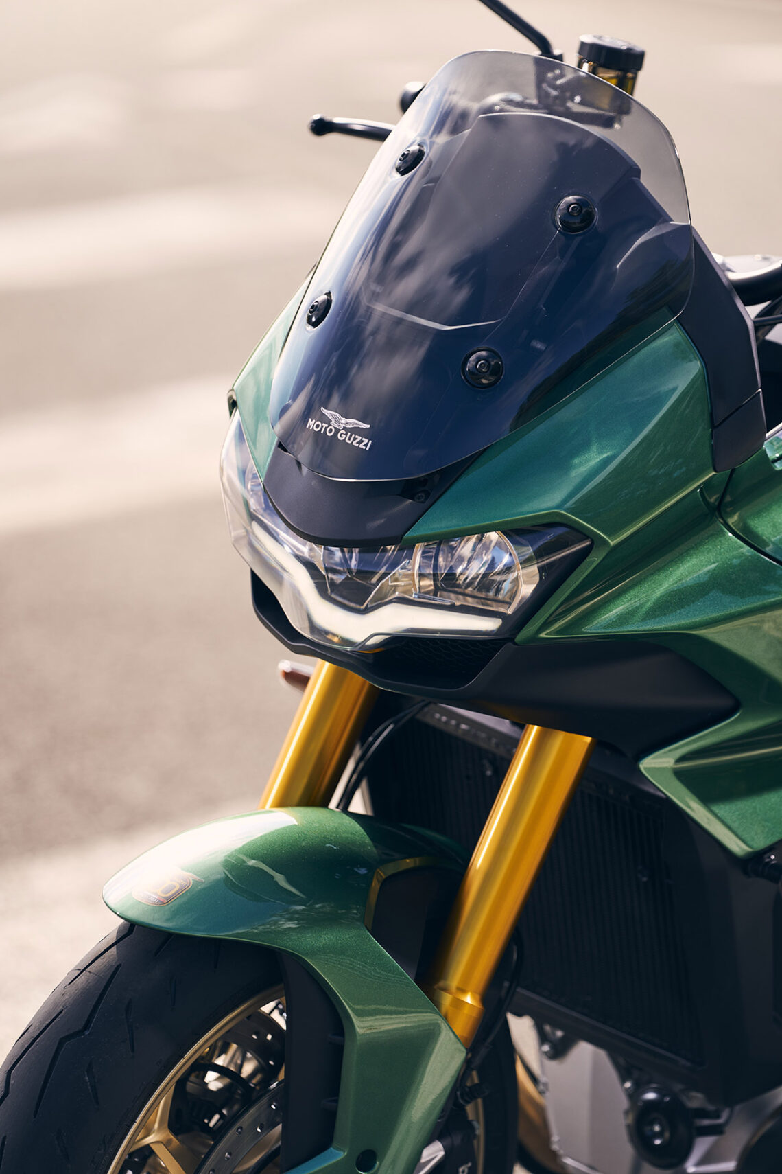 En MOTORBIKE MAGAZINE tuvimos el placer de probar la versión S, más premium. Esta se diferencia de la estándar en sus suspensiones semi-activas Öhlins Smart EC 2.0., Quickshifter (cambio sin embrague), puños calefactables, TPMS (indicador de presión de los neumáticos) y conectividad a través de Moto Guzzi MIA.