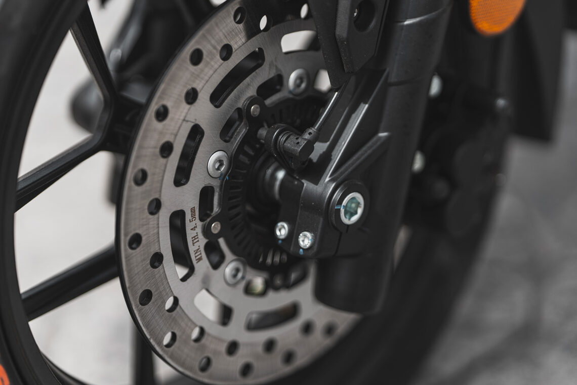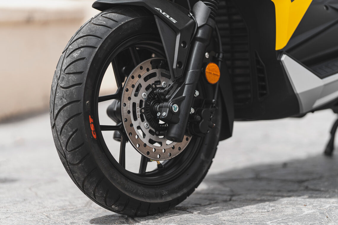 Respecto a su parte ciclo, Wottan nos proporcionó la Storm-V +, que se diferencia de la versión estándar por disponer de sistema ABS (en lugar de CBS. Sus frenos nos gustaron bastante, deteniendo rápidamente este scooter de 172 kg y con un ABS poco intrusivo. El tarado de su suspensión es duro, dándole un toque de deportividad, aunque sacrificando en cierto modo el confort. Eso sí, le otorga mucha confianza en curvas y su ángulo de giro es ideal para ciudad.