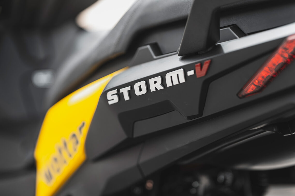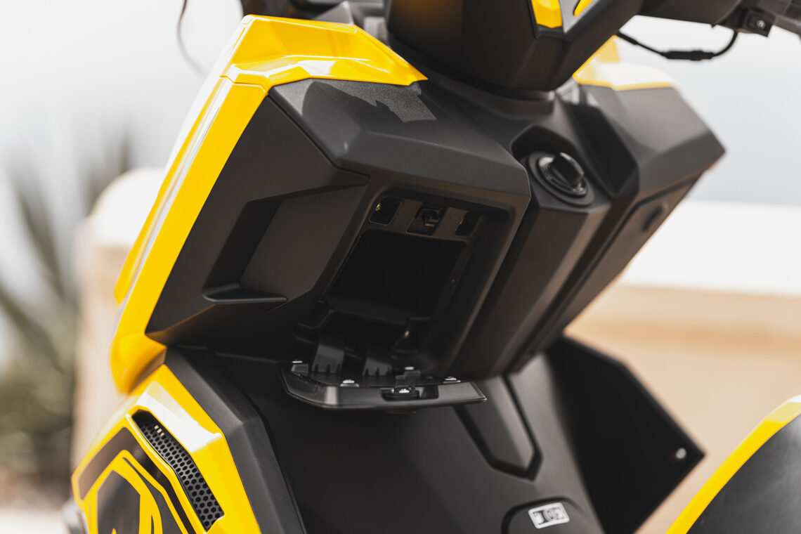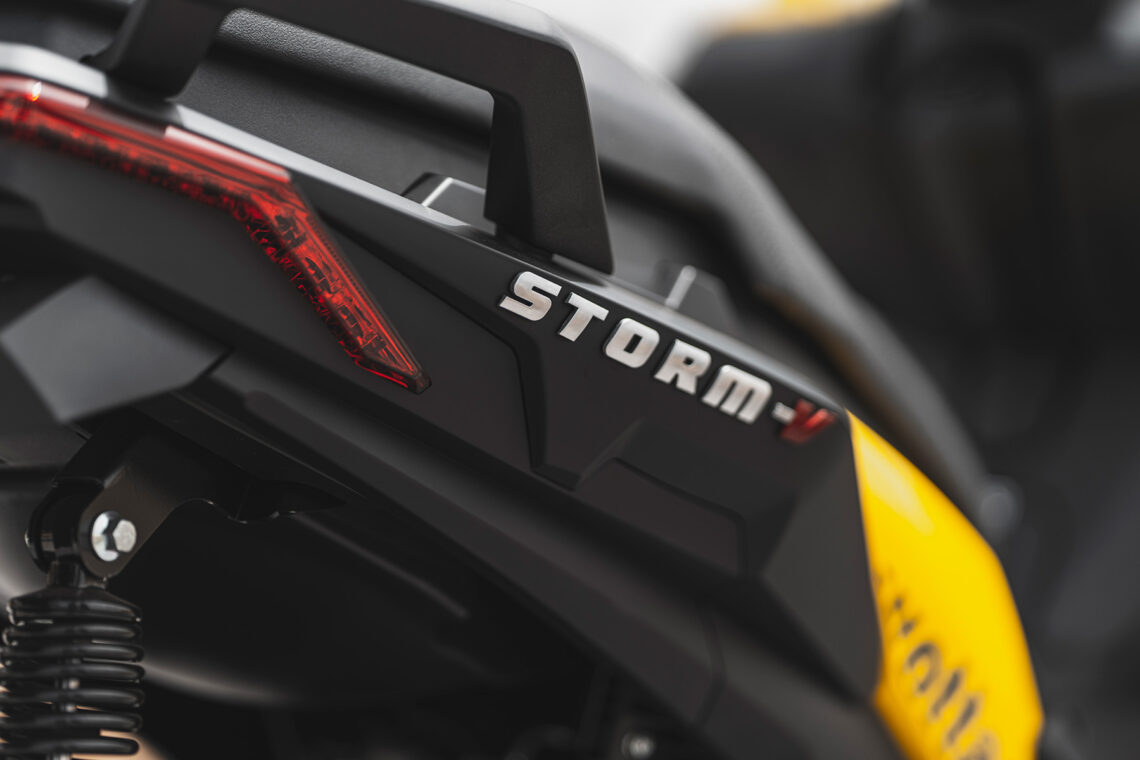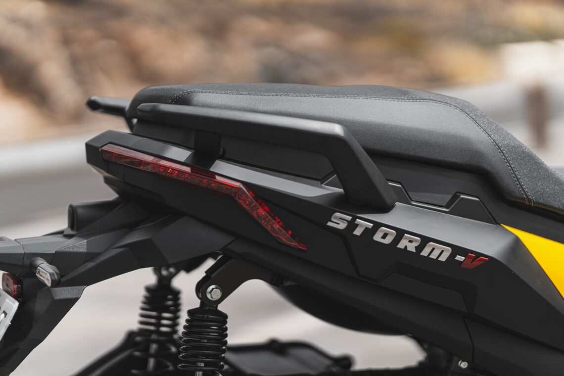 A nivel equipamiento, destaca por su pantalla de 7’’ con Bluetooth de serie para conectar el móvil y poder avisarte de notificaciones, pudiendo ajustar su brillo en marcha gracias a un botón muy accesible. La versión Storm-V + dispone de una llave de proximidad Keyless, que incluye a su vez una alarma de seguridad pero sólo activa sus intermitentes, sin alarma sonora. Bajo el asiento presenta un espacio suficiente para guardar un casco integral, siempre y cuando éste no sea muy voluminoso en sus formas. Bajo los mandos, dispone de dos guanteras muy útiles para guardar tus pertenencias mientras estás en marcha, sin cierre con llave.