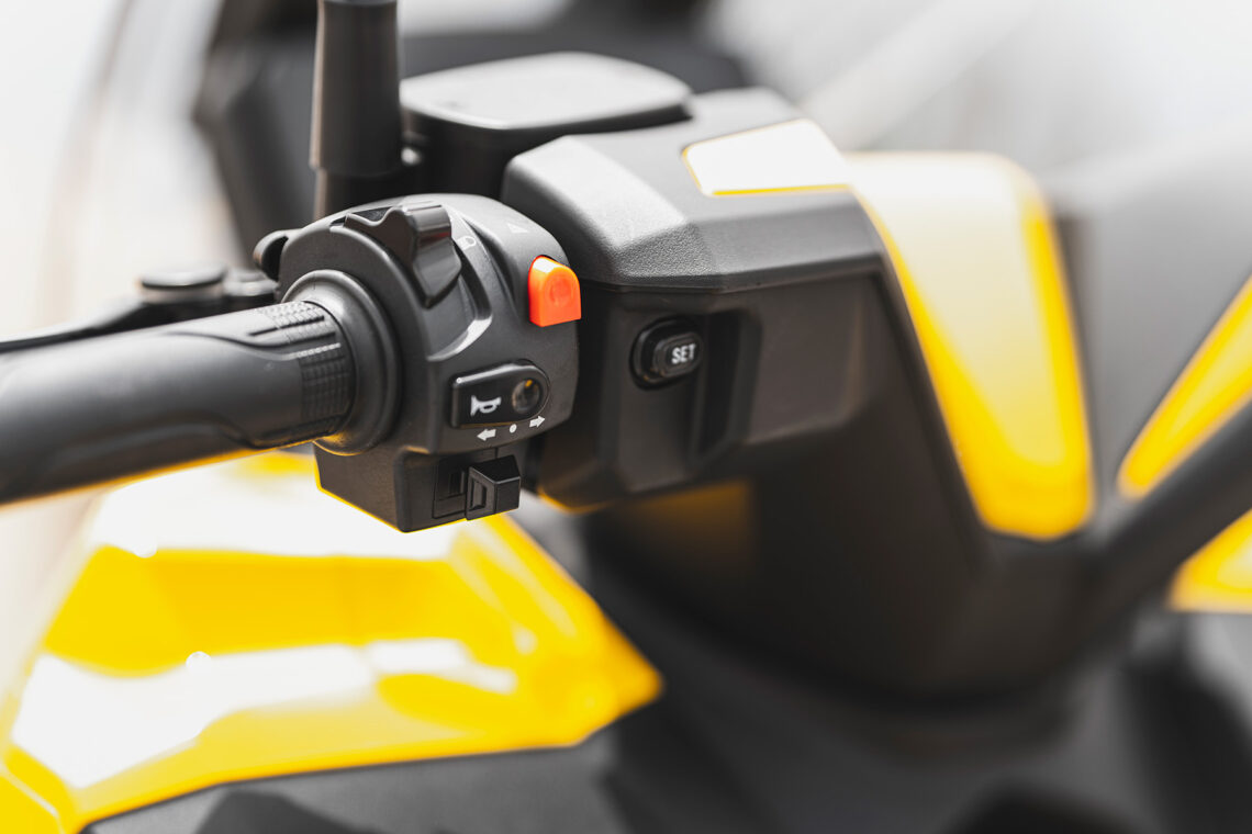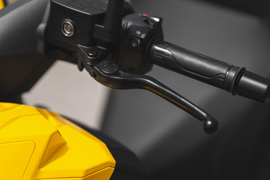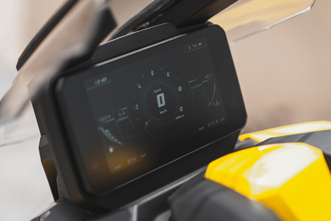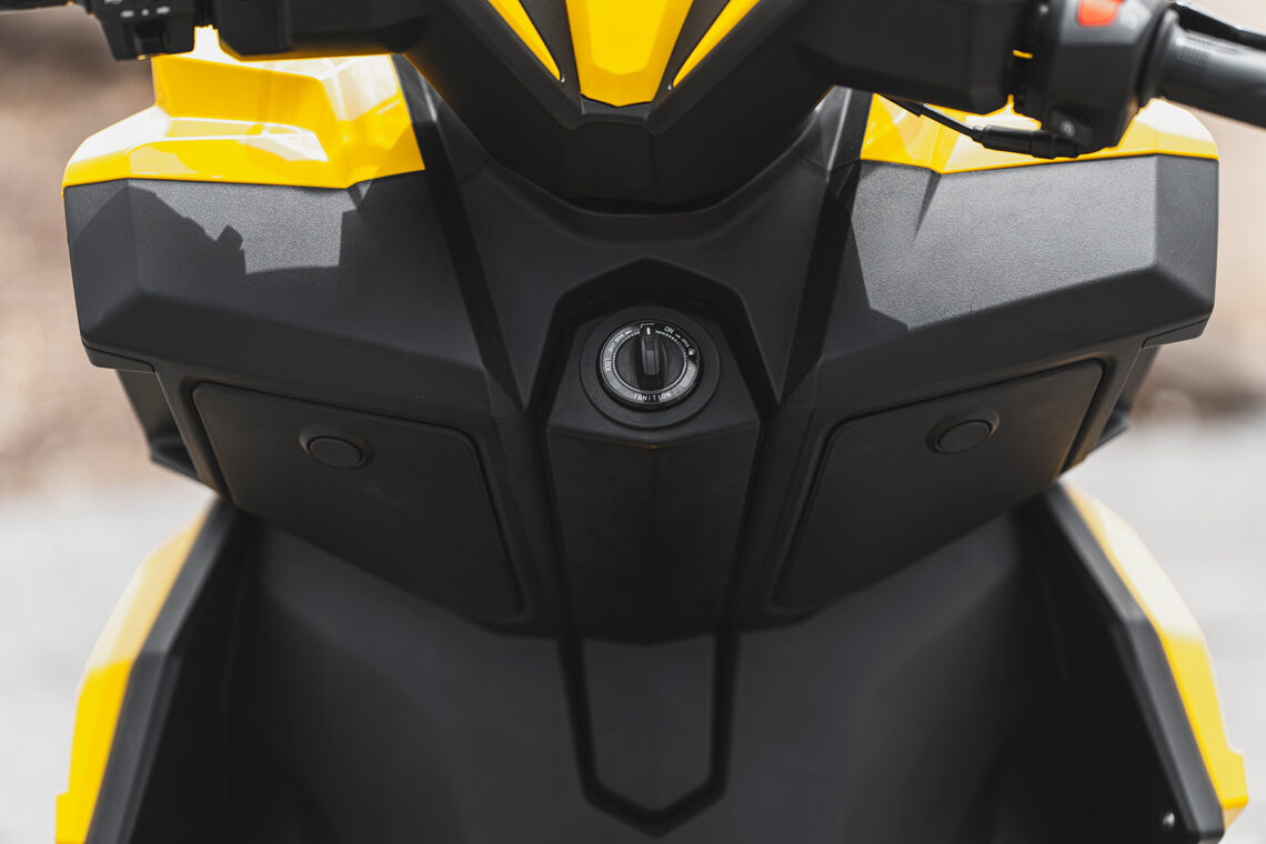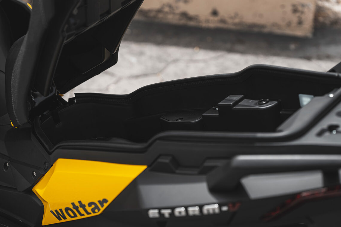 A nivel equipamiento, destaca por su pantalla de 7’’ con Bluetooth de serie para conectar el móvil y poder avisarte de notificaciones, pudiendo ajustar su brillo en marcha gracias a un botón muy accesible. La versión Storm-V + dispone de una llave de proximidad Keyless, que incluye a su vez una alarma de seguridad pero sólo activa sus intermitentes, sin alarma sonora. Bajo el asiento presenta un espacio suficiente para guardar un casco integral, siempre y cuando éste no sea muy voluminoso en sus formas. Bajo los mandos, dispone de dos guanteras muy útiles para guardar tus pertenencias mientras estás en marcha, sin cierre con llave.