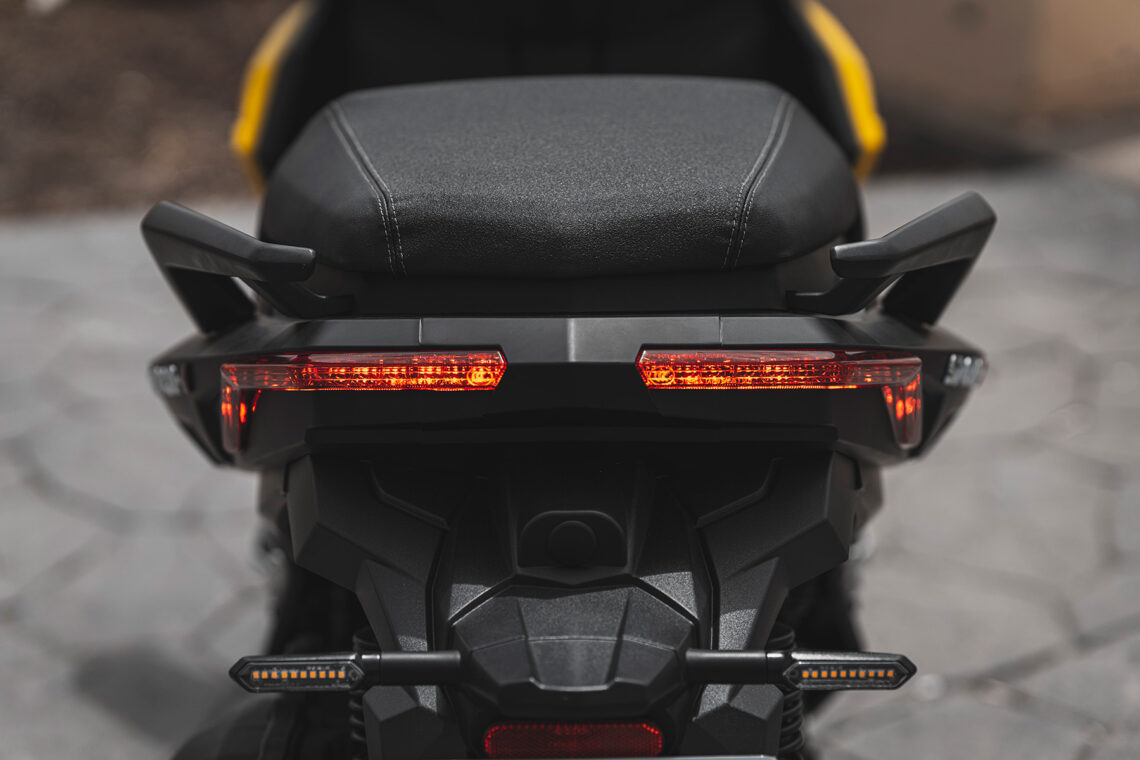 La comodidad es uno de los aspectos más importantes de un scooter. En este caso, su posición es bastante erguida, con el manillar cerca y elevado, al igual que el frontal. Las plataformas no disponen de una zona más vertical, pero sí que permite ‘tirar’ los pies más hacia delante. Los retrovisores, al estar anclados a un manillar tan cerca, debes forzar un poco la mirada para llegar a verlos, aunque disponen de muchísima visibilidad. Su asiento es bastante cómodo y te envuelve, sin llegar a encajonarte, mientras que su pantalla, aunque puede parecer poca cosa, protege bastante del viento.