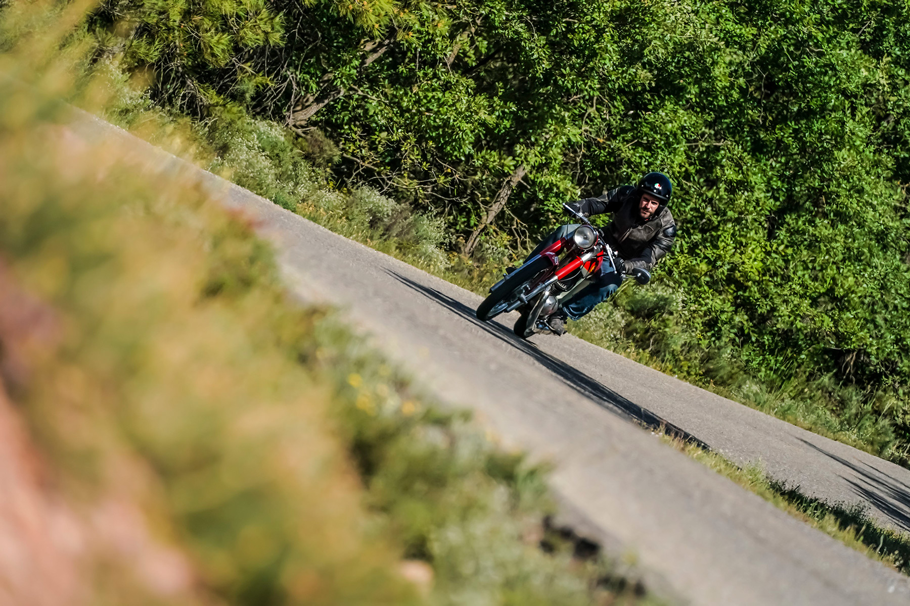 El motor es, como dirían hoy en día, "muy de carreras", con sus 26 cv disponibles en la zona final del tacómetro y con una "patada" rabiosa a partir de medio régimen. Las suspensiones subían y bajaban sin freno hidráulico y el reparto de pesos era similar al de una custom. La entrada a curva era sorprendentemente ágil, pero su estabilidad en curva te obligaba a reconsiderar las velocidades... y las físicas modernas. Los frenos son todo lo contrario a lo que esperas: el delantero es inexistente, además de ofrecer un tacto muy raro, con la maneta haciendo contacto con el puño y una frenada paulatina. Sin embargo, el trasero tenía una mordida espectacular, con la que debías re-aprender a modular y evitar ahogar el motor. Todo un desafío.