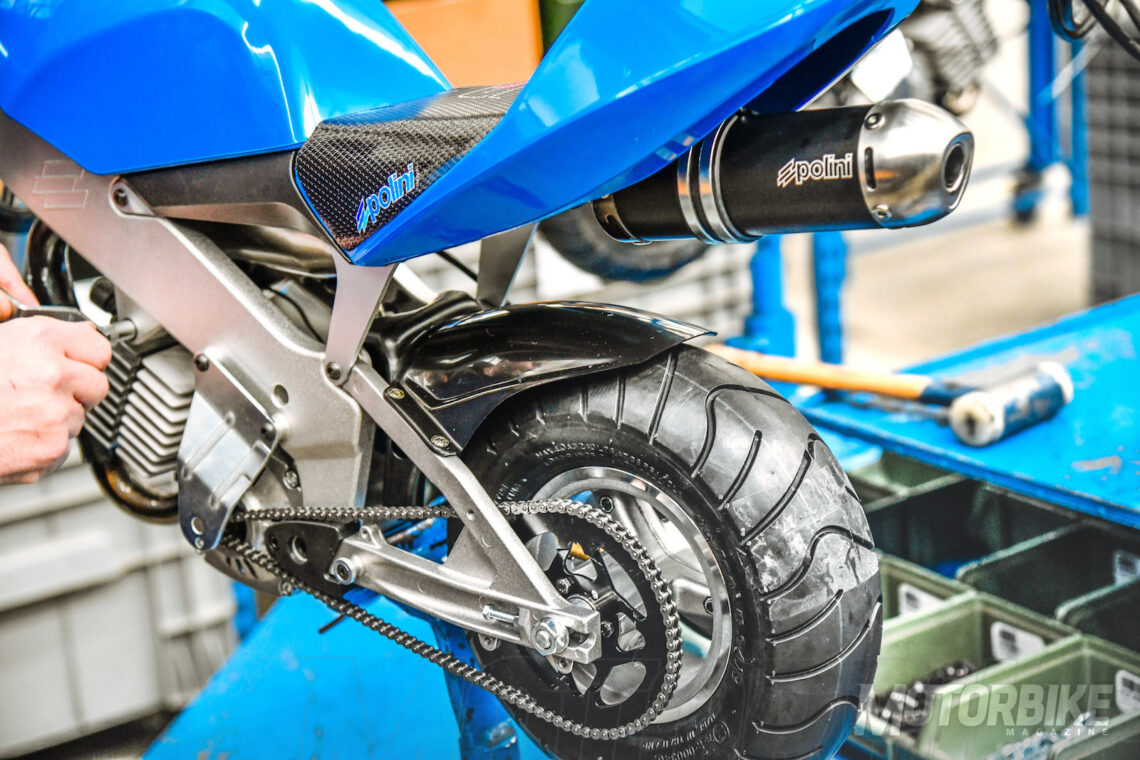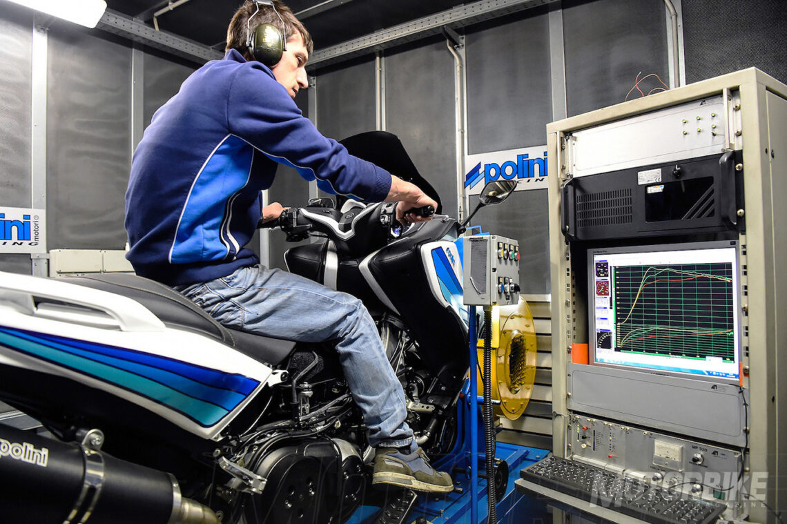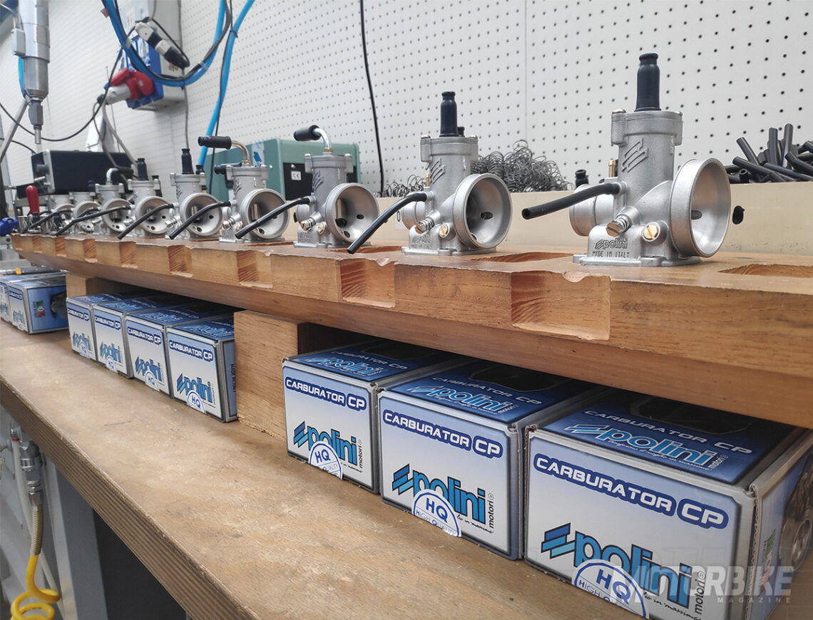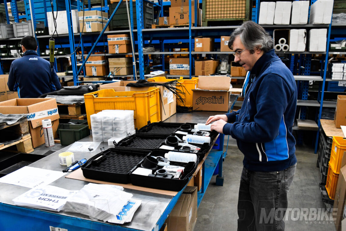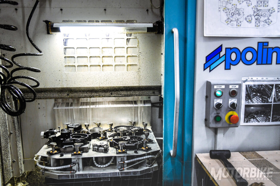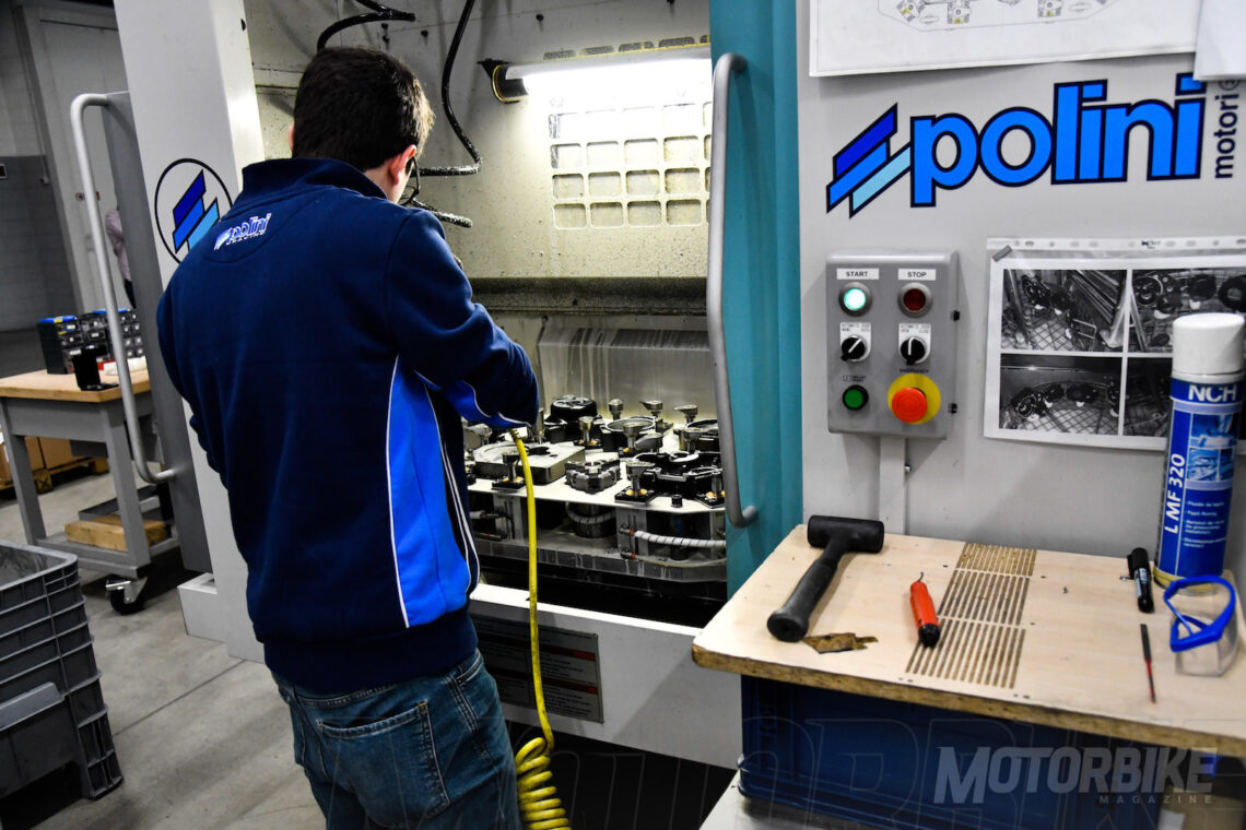 La fábrica de Polini cuenta con algo más de 70 empleados, quienes se encargan de diseñar cada componente, desarrollarlo, fabricarlo, ensamblarlo, ajustarlo, probarlo, empaquetarlo y enviarlo. Por supuesto, también tienen una amplia sección de reparación y preparación. Por ejemplo, todas las piezas que supongan, además de un recambio, una mejora de rendimiento, son estudiadas a fondo en diferentes bancos de potencia (tanto medidores de potencia al cigüeñal como a la rueda).