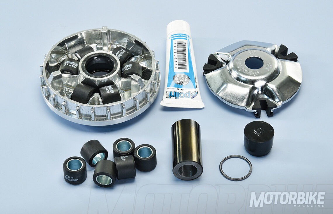Por otro lado, encontramos el que seguramente sea área más grande y económico de la empresa; el del recambio de componentes para scooters de 4 tiempos, desde embragues, variadores, rodillos, transmisiones, ejes, etc. Aquí es donde pudimos probar estos componentes en diferentes scooters del mercado: Polini puso a nuestra disposición un scooter KYMCO People 125s con un kit de variador Polini, y un KYMCO X-Citing S 400 con variador y transmisión Polini. Ciertamente, sobre el 125 se percibía una considerable mejora en términos de aceleración, aunque bajo unas prestaciones comedidas al tratarse de un 125. Sobre el scooter de alta cilindrada la aceleración obtenida era peligrosamente superior, con el reprís y la fuerza de un 500, y con una capacidad de alcanzar sus máximas prestaciones que daba bastante miedo. Lo mejor de todo es que se trataba de la última versión del XCiting S 400, un scooter que tuve la suerte de asistir a su presentación hace meses y que, descubrí como la nueva normativa Euro5 lo había capado bastante. Fácil y sencillo oiga, el motor estará reprimido por el exigente y restrictivo catalizador, pero el kit Polini supo y pudo rescatar su verdadera garra y más.