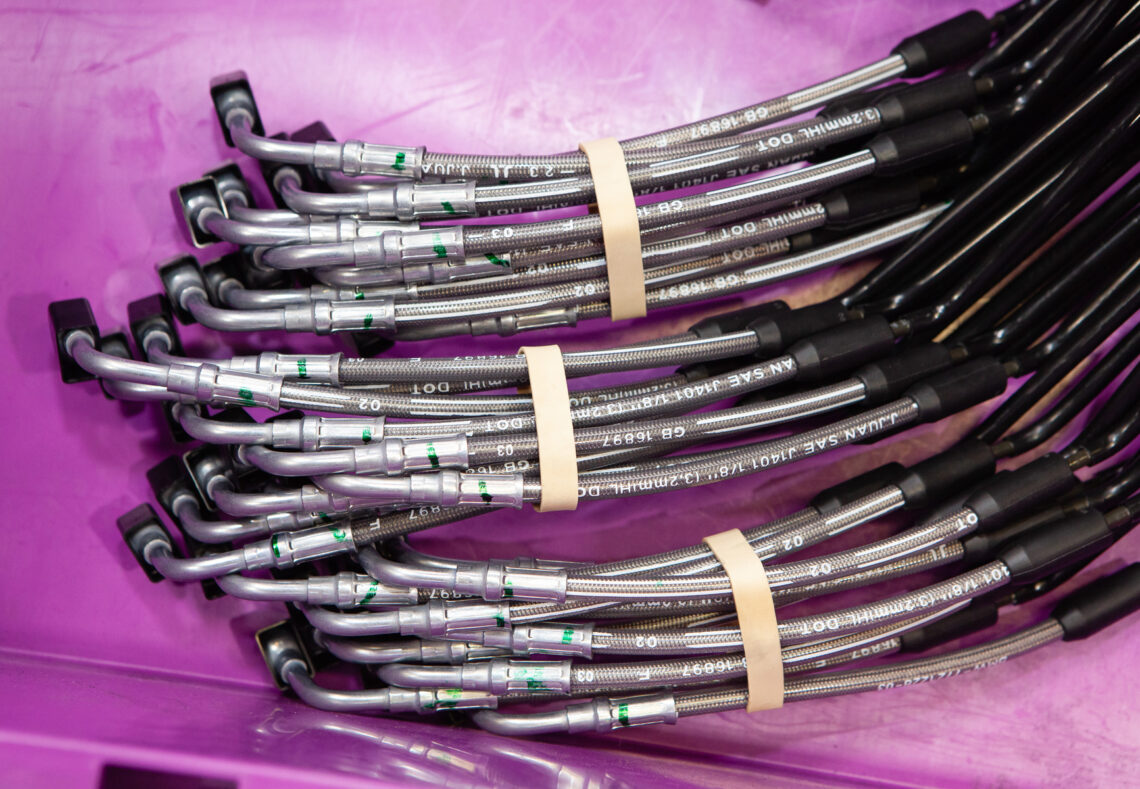 La especialidad de J.Juan es el latiguillo metálico trenzado, pero producen prácticamente cualquier producto relacionado con los sistemas de freno, excepto pastillas –aunque se pactan con el cliente y las instalan para entregar sistemas terminados–. Y es que la empresa española trabaja bajo pedido, mayoritariamente OEM, lo que significa que proveen a fabricantes de motos de producto para sus modelos de serie.