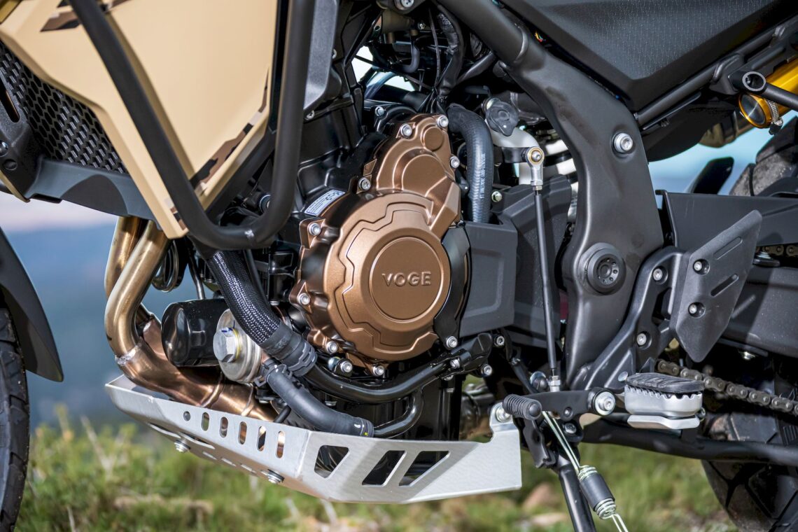 El propulsor de la VOGE 625DSX es un bicilíndrico en paralelo DOHC 8 válvulas Euro 5+ refrigerado por agua con 581 cc, 63 CV a 9.000 rpm, 57 Nm a 6.500 rpm, cigüeñal calado a 270º, accionamiento de válvulas mediante balancines (menos peso/inercias), nuevo intercambiador agua-aceite, embrague antirrebote e inyección electrónica Bosch MSE6.0. La electrónica incluye doble modo de conducción (Estándar y Sport), ABS de doble canal (desc. ambas ruedas) y control de tracción (desc.).