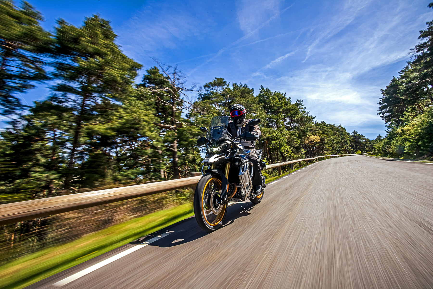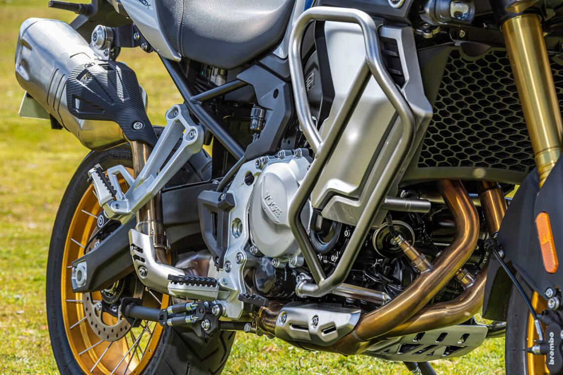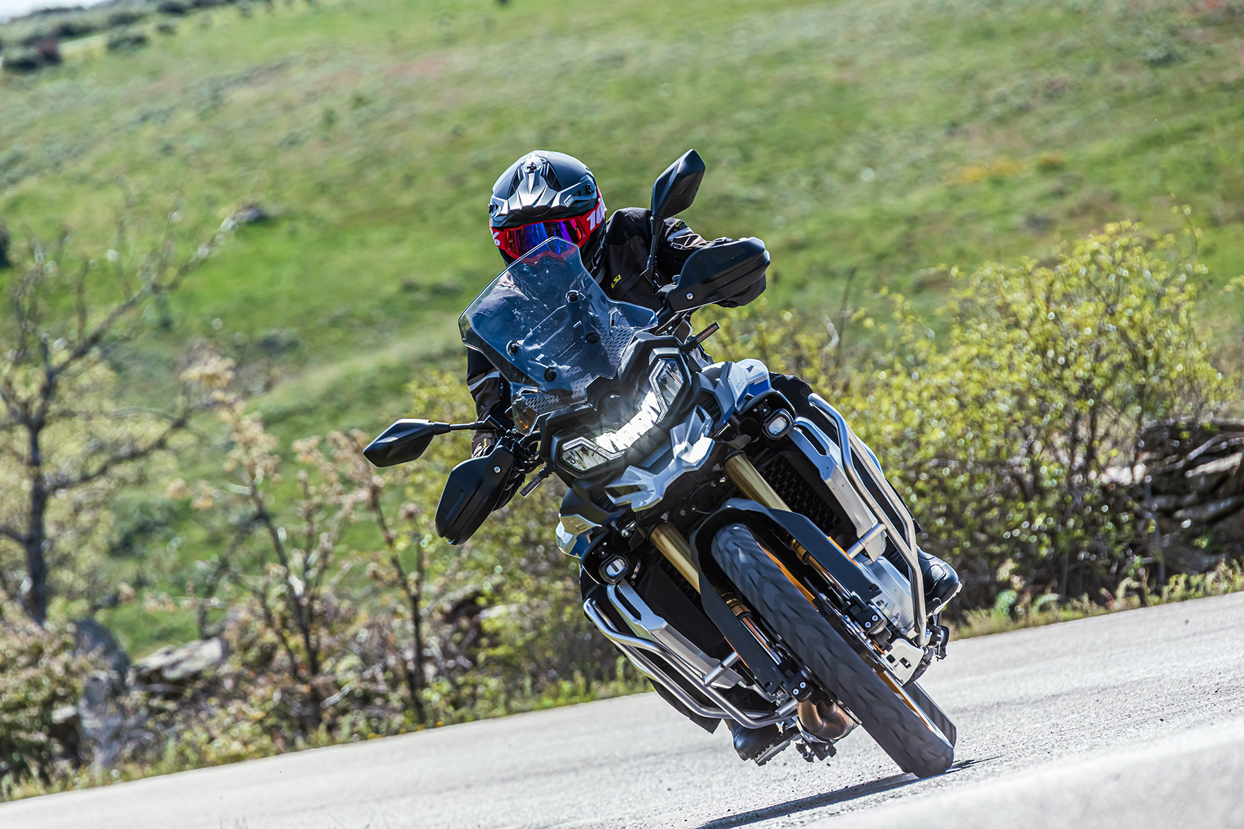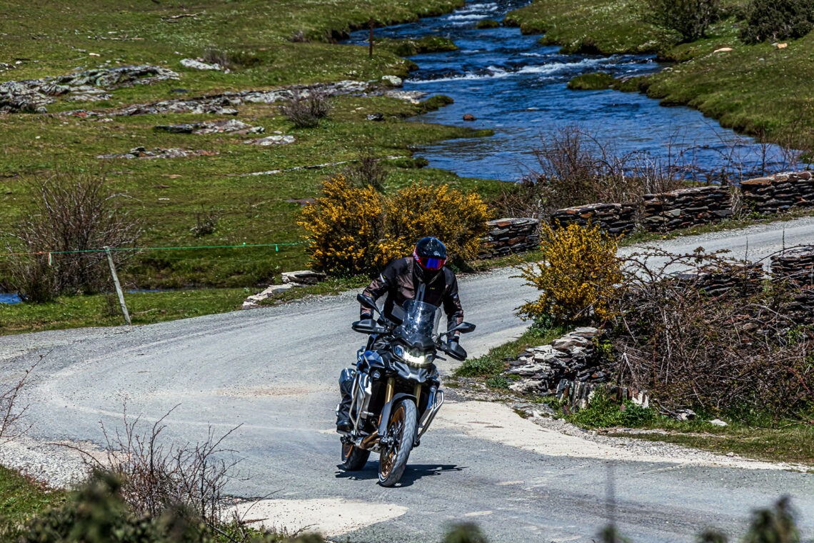 En lo que respecta al motor, el tacto del bicilíndrico de 895 cc me recuerda más al de la BMW F 850 GS que al de la BMW F 900 GS, tanto por desarrollo (largo) como por potencia (10 CV menos). Cada uno de los modos de conducción (los seleccionas desde el botón MODE de la piña derecha) te otorga una entrega de potencia más/menos directa a las insinuaciones del gas. En Sport el tacto de gas es algo seco, quizá más de puesta a punto del acelerador electrónico que otra cosa, por lo que prefiero rodar todo el rato en Road. Con el tacto del cambio sucede lo mismo, algo duro, quizá debido a la falta de rodaje de nuestra unidad, por lo que prefiero usar la maneta como en una moto convencional en lugar del quickshifter. El consumo medio durante nuestra prueba fue de 5,5 l./100 km, lo que te otorgará una autonomía de unos 300 km.