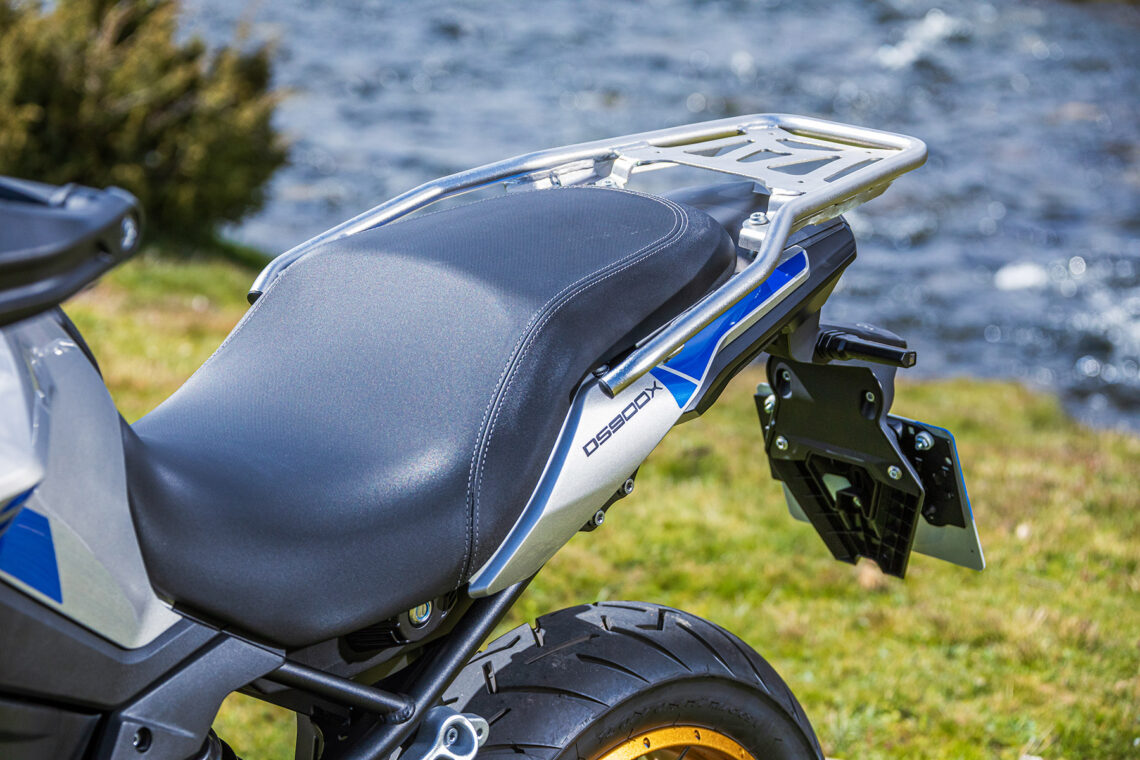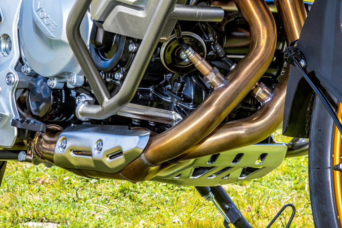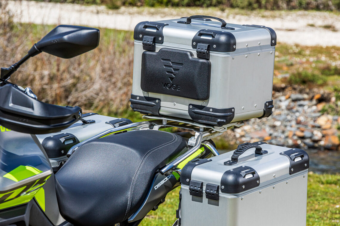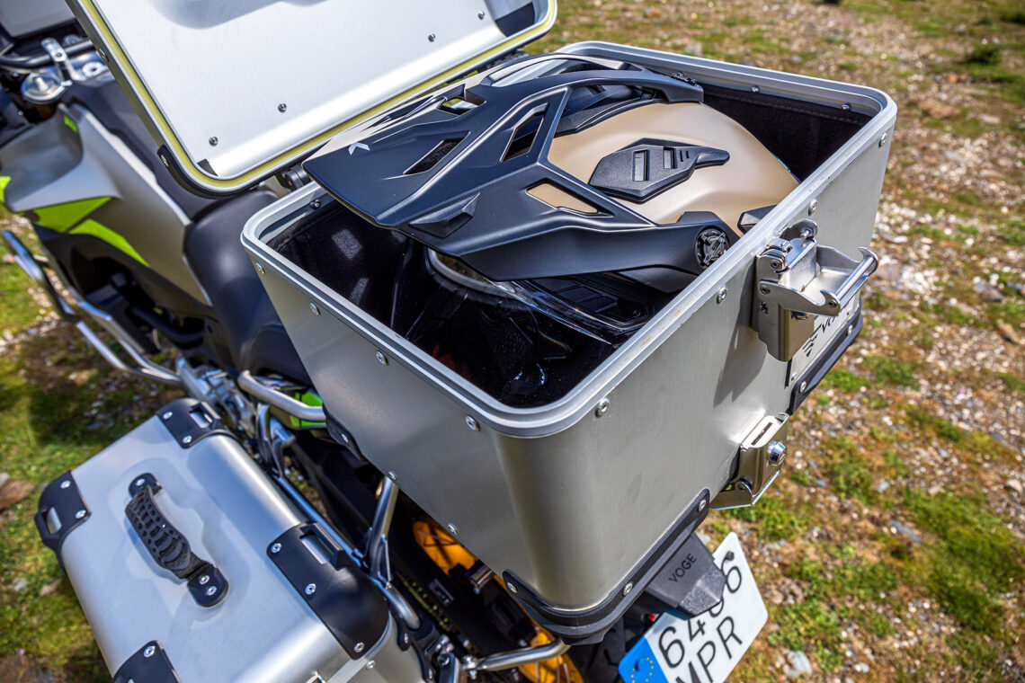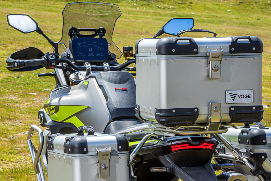 También incluye piñas retroiluminadas, parabrisas corto (reg. manualmente dos posiciones), manetas regulables, caballete central, parrilla trasera portabultos (incluye base para baúl), varias protecciones (cubremanetas, carrocería, carter, colector) y tapas plásticas en símil carbono. VOGE declara 215 kg en seco y el depósito de gasolina alberga 17 l.