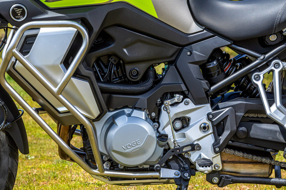 El propulsor de la VOGE 900DSX, compartido con las BMW F 900 XR A2 y BMW F 800 GS, es un bicilíndrico en línea DOHC 8 válvulas refrigerado por agua con cigüeñal calado a 270º (imita al tacto de un V2), 895 cc, 95 CV a 8.250 rpm, 95 Nm a 6.250 rpm, embrague antirrebote, inyección electrónica Bosch y cambio semiautomático bidireccional. Las revisiones periódicas se establecen cada 10.000 km. La electrónica presente en esta VOGE incluye cuatro modos de conducción (Rain -93 CV-, Road, Sport, Enduro), ABS de doble canal (desc. ambas ruedas), control de tracción (desc.) y control de velocidad.
