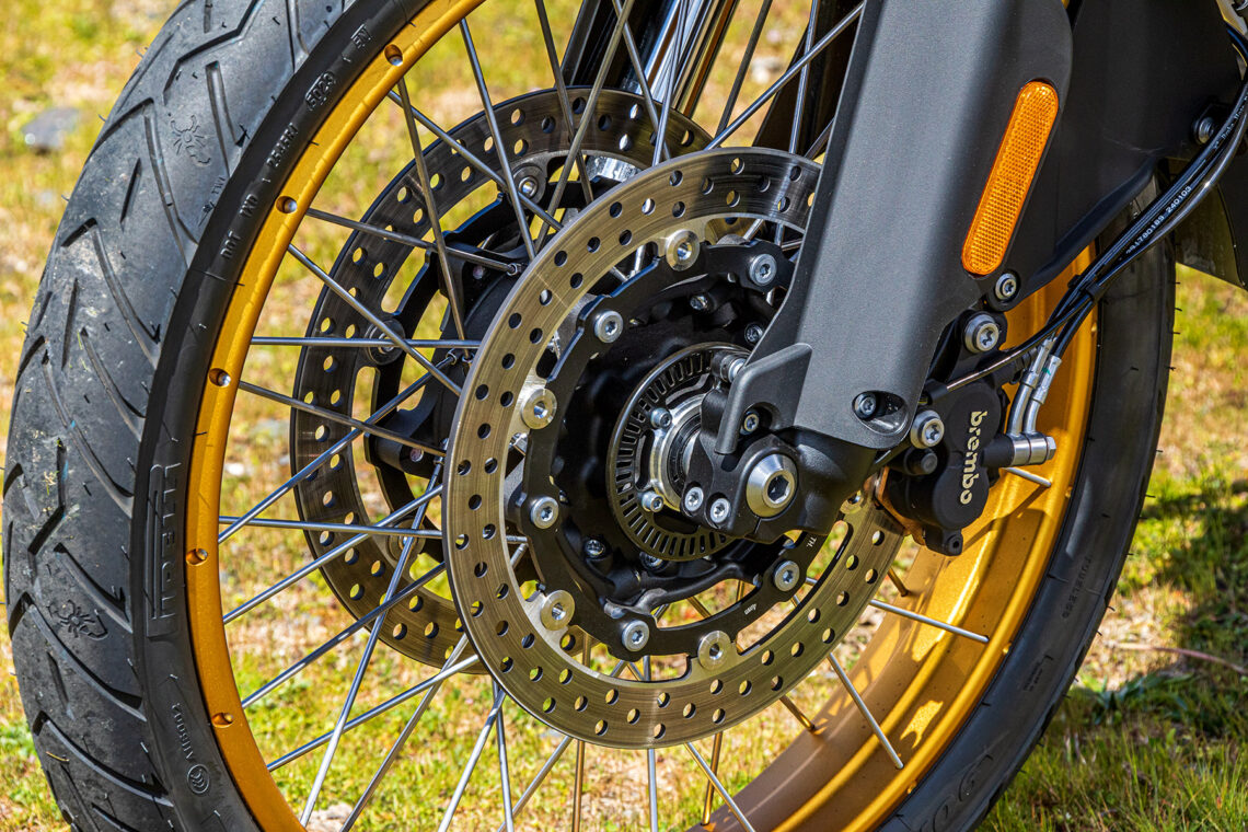 A nivel ciclo encontramos un chasis perimetral de acero con subchasis tubular atornillado y basculante de aluminio, suspensión Kayaba (horquilla invertida de 43 mm multirreg. -ext. barra izda. y comp. barra derecha- y monoamortiguador trasero con bieletas reg.precarga -pomo-/extensión), amortiguador de dirección, llantas de radios tubeless (delantera de 21 pulgadas), pinzas de freno Brembo (del. axiales y bomba radial) y neumáticos Pirelli Scorpion Trail II.
