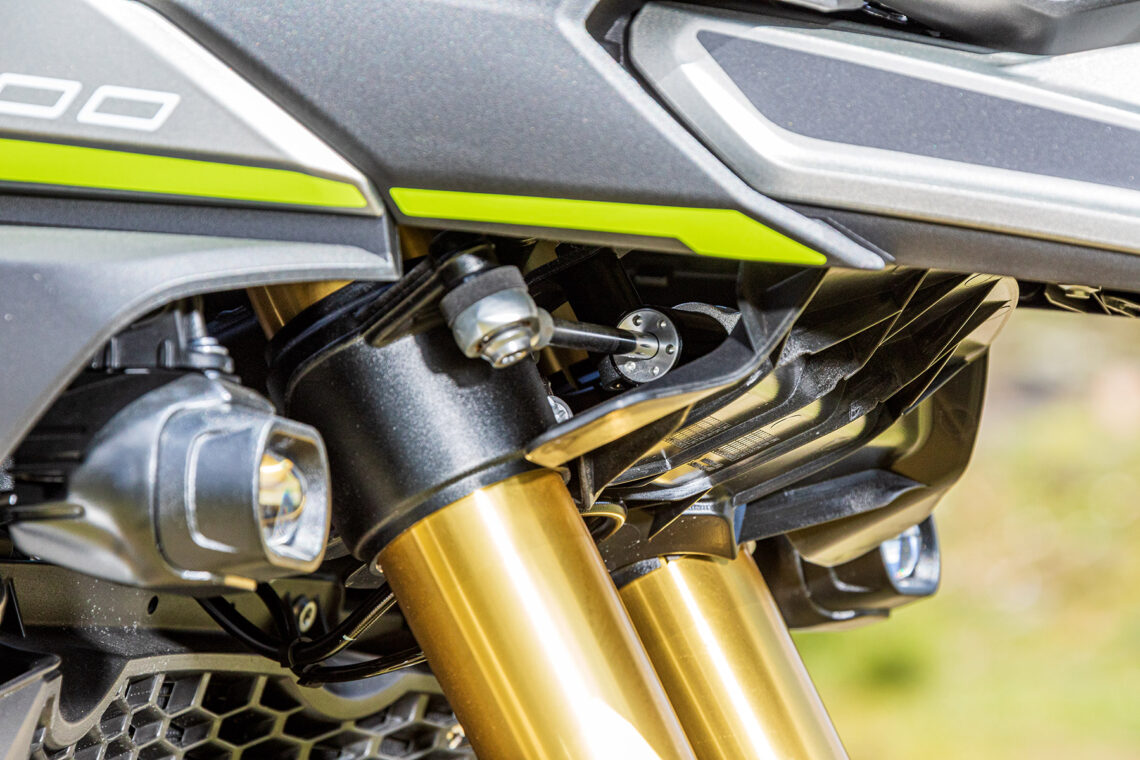 El ingente equipamiento de serie se completa con cámara de vídeo frontal HD, radar trasero (desc.), triple toma de corriente (12V + USB + C), iluminación full-LED con DRL y faros anti-niebla, instrumentación TFT a color de 7" (incluye conectividad bluetooth y navegación turn-by-turn), iluminación de emergencia en frenada (la luz parpadea en deceleraciones bruscas), puños/asiento de conductor calefactables (3 intensidades, piña izda.) y llave de proximidad.