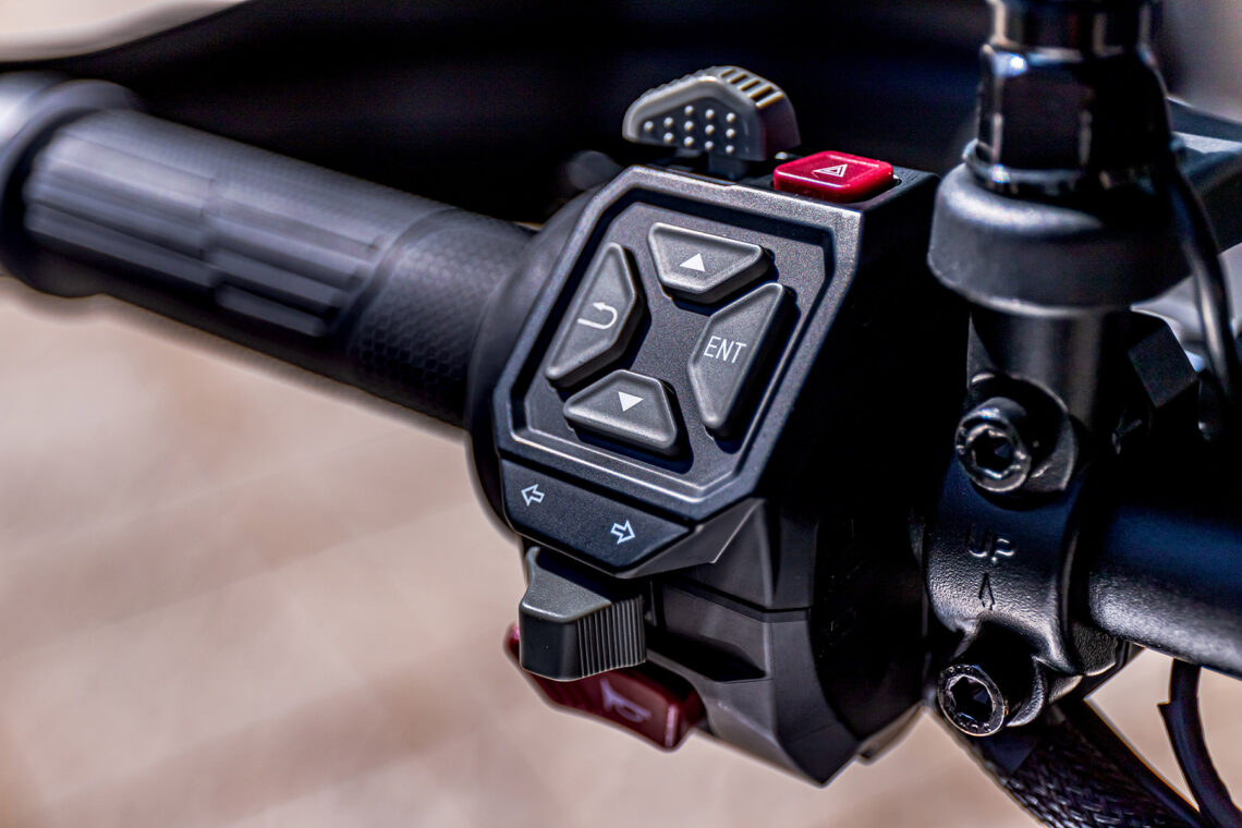 Para activar el modo Enduro hay que presionar el botón MODE durante unos segundos en lugar de dar pulsaciones cortas (necesarias para jugar con los otros tres modos). Una vez seleccionado, control de tracción y ABS (en ambas ruedas) se desactivan, dejándonos libertad para manejarla a nuestro gusto sin ayudas electrónicas.