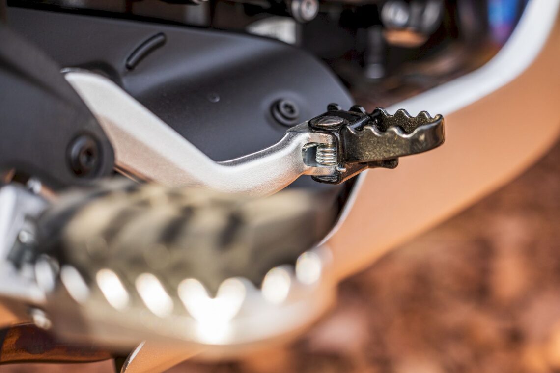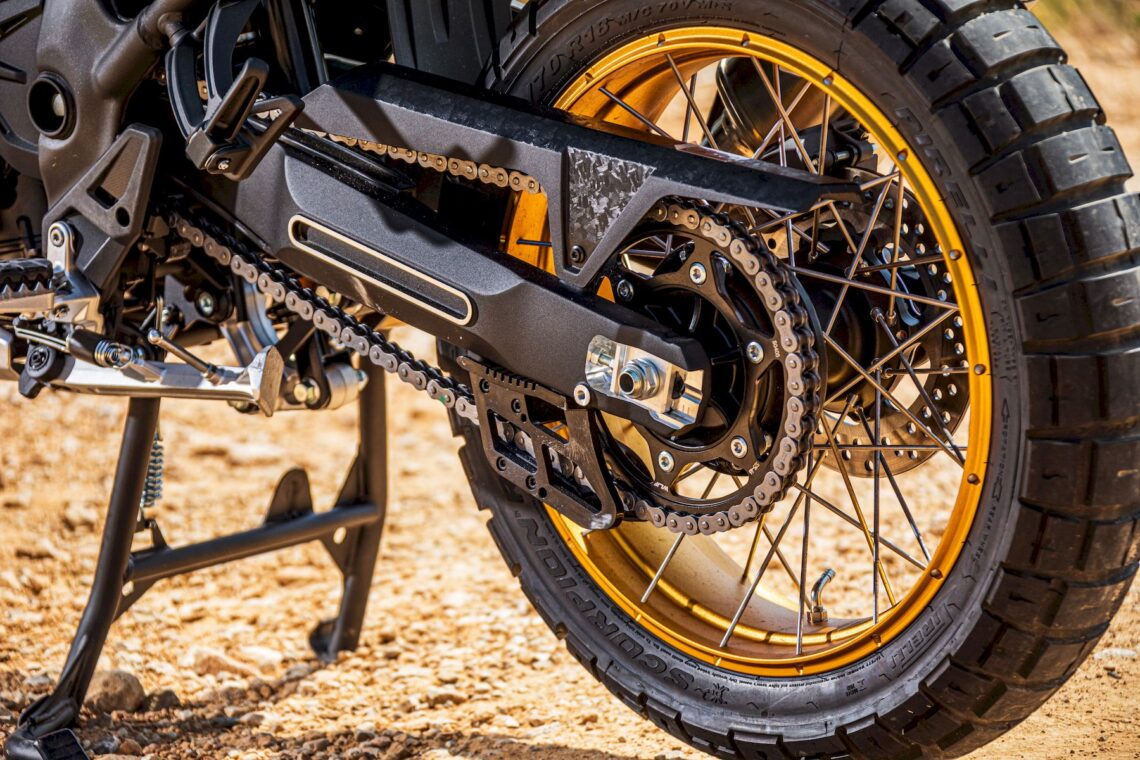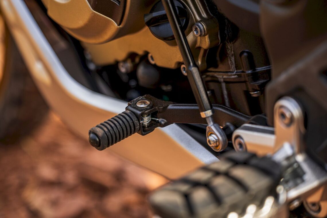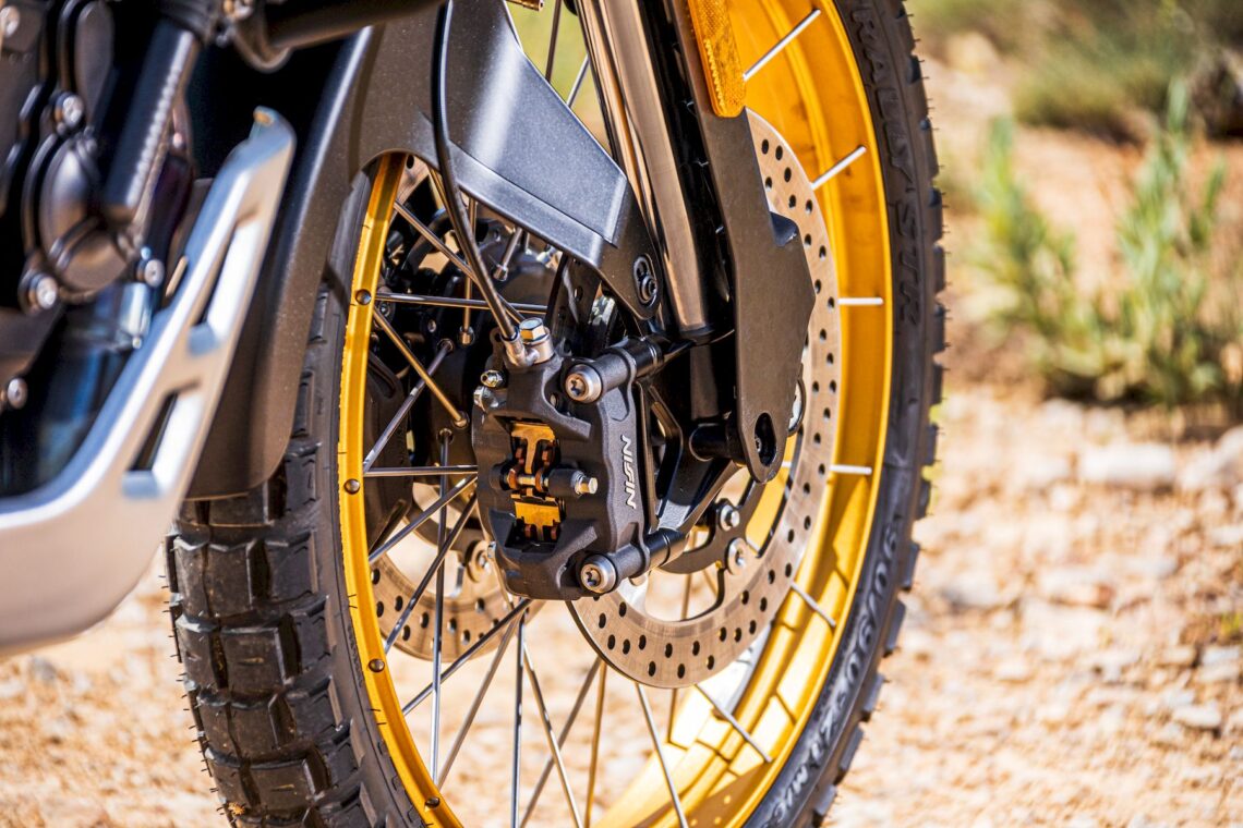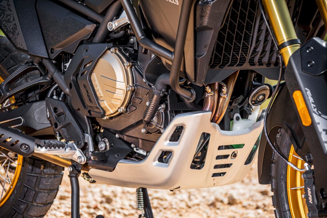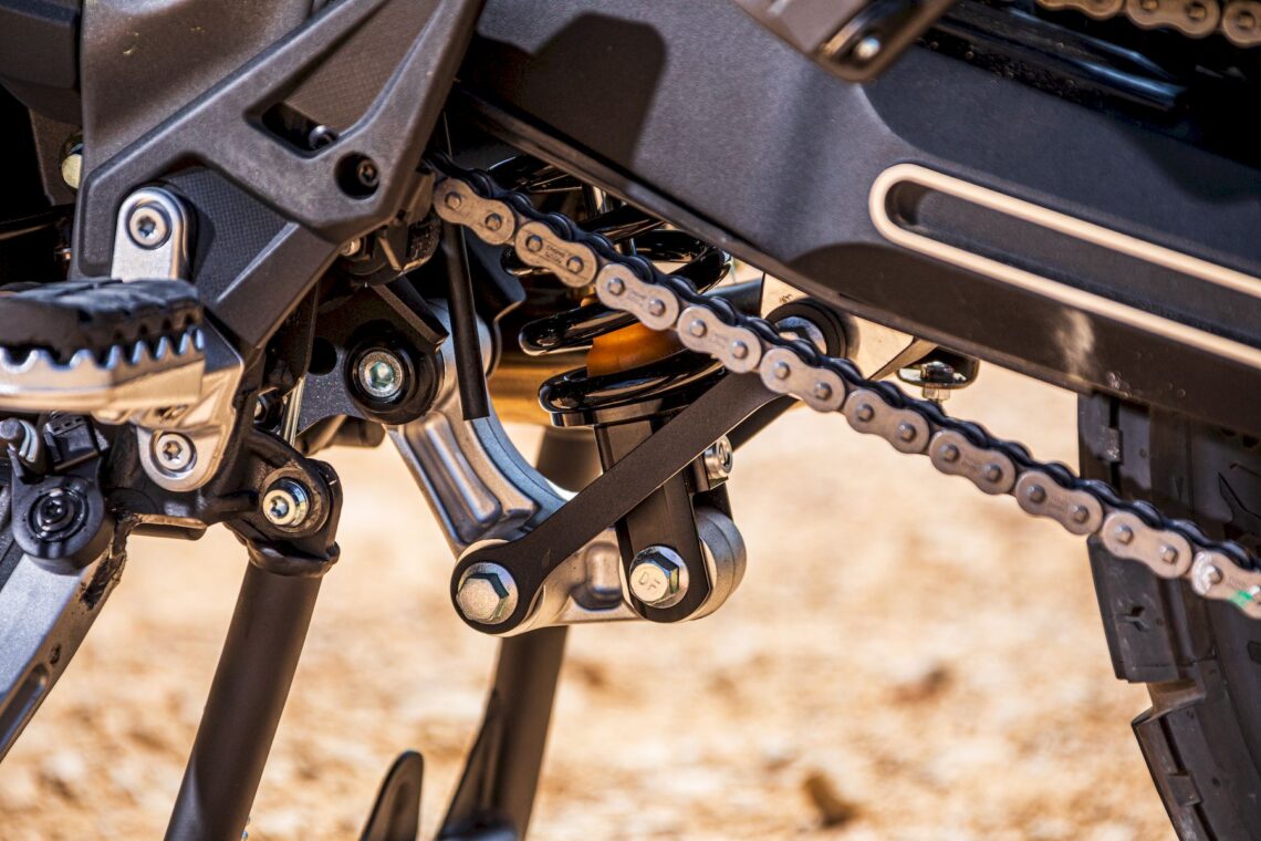 Otras características destacables pasan por su chasis perimetral de acero (subchasis soldado) y basculante de aluminio, suspensión multirregulable KYB (horquilla invertida de 43 mm con 20 cm de recorrido y monoamortiguador trasero con botella de gas separada, bieletas, pomo de precarga y 19 cm de recorrido), amortiguador de dirección rotativo (regulable), llantas de radios Henly tubeless con medida enduro (delantera de 21" y trasera de 18") con sensor de presión de neumáticos (Pirelli Scorpion Rally STR) y válvulas acodadas. El equipo de frenos está firmado por Nissin (pinzas delanteras radiales de 4 pistones) y tiene latiguillos metálicos (bajan separados).