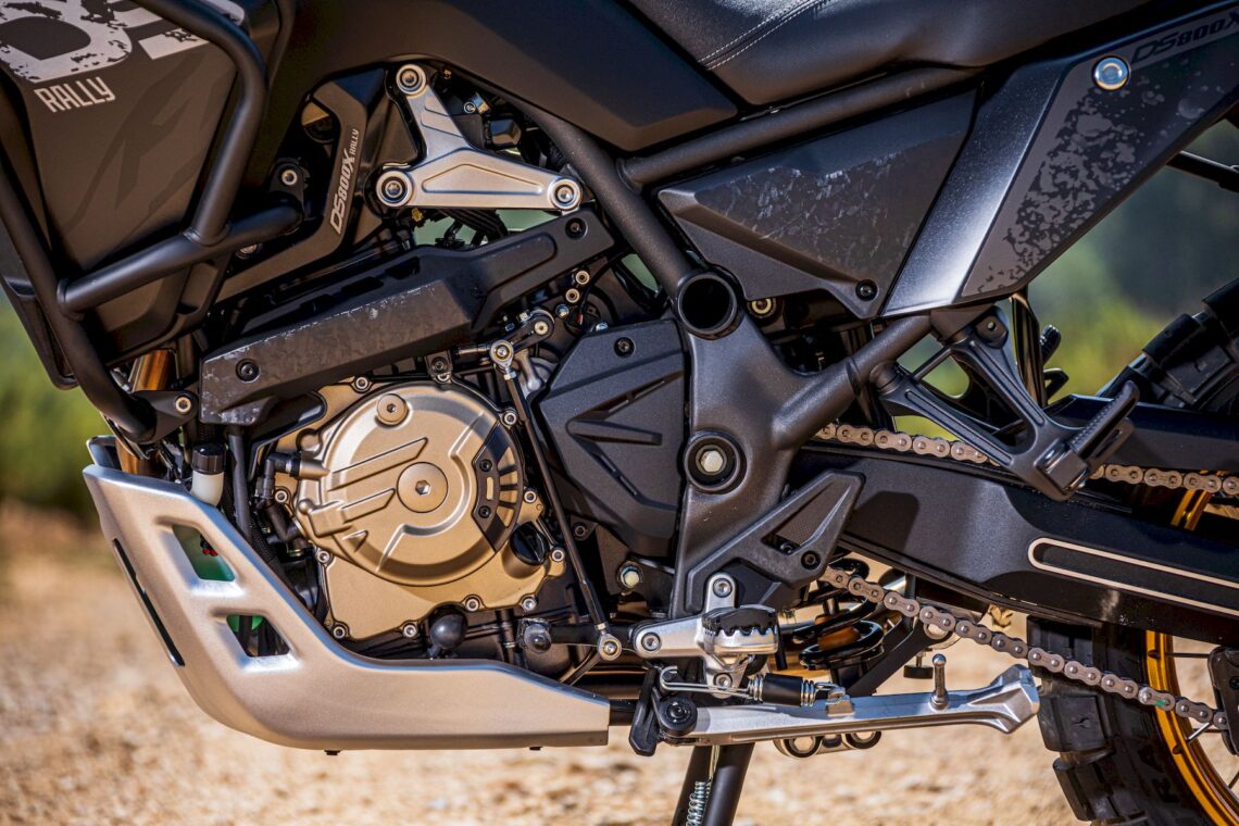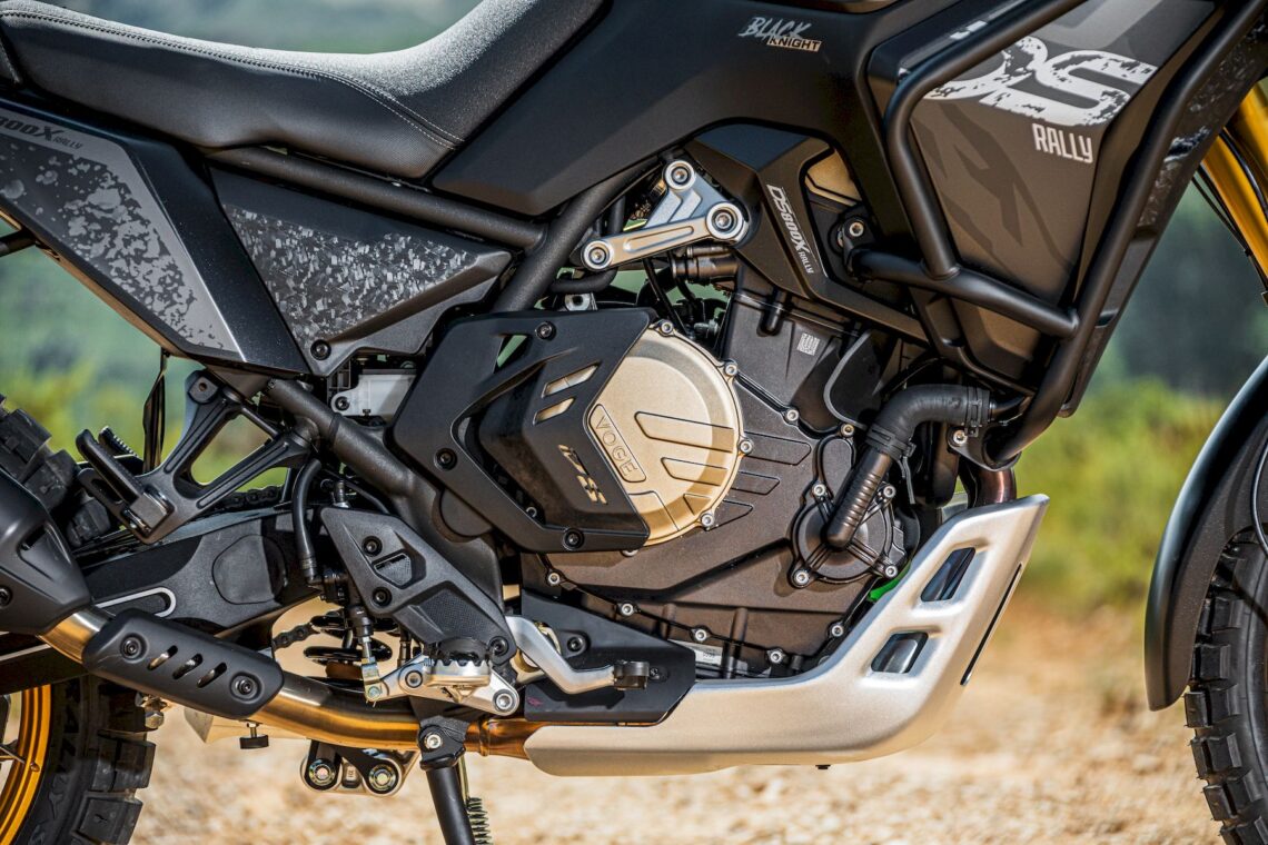 El propulsor de la VOGE DS800 Rally es un bicilíndrico en paralelo DOHC 8 válvulas Euro 5+ de carrera larga (84 x 72 mm) refrigerado por agua con 798 cc, 95 CV a 9.000 rpm, 81 Nm a 6.500 rpm, cigüeñal calado a 270º con doble eje de equilibrado (minimizar vibraciones), embrague antirrebote con mando hidráulico e inyección electrónica Bosch. También dispone de accionamiento de válvulas mediante balancines (menos peso/inercias), doble bomba de aceite para lubricación por cárter semiseco (lubricación suficiente en inclinación máxima) e intercambiador de calor agua/aceite (mejor control de la temperatura del lubricante). La electrónica incluye doble modo de conducción (Normal y Sport), ABS de doble canal (desc. ambas ruedas o sólo en la trasera) y control de tracción (desc. con botones independientes específicos).