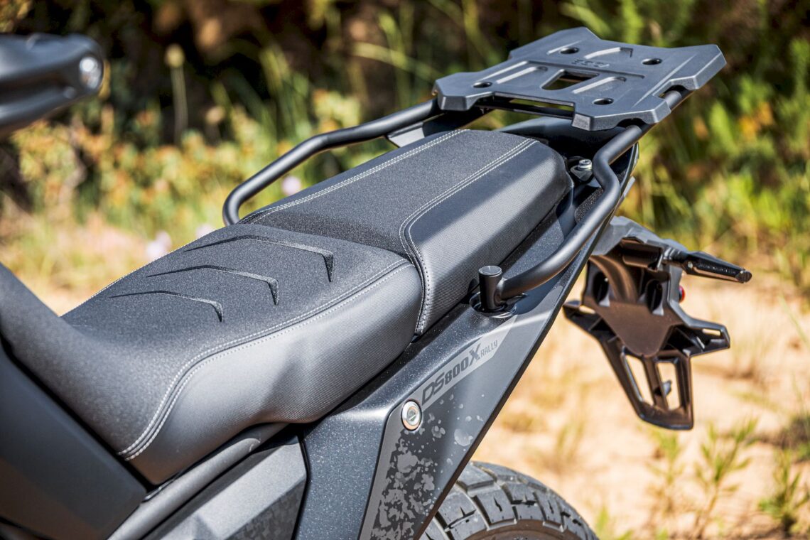 Si queremos salir del asfalto, la DS800 Rally se desmarca de la 900DSX, ampliando así el abanico de uso off-road respecto a su hermana mayor. Hablamos de 16 kg menos, 3 cm más de altura libre y un arco de pierna estrechado para abrazar cómodamente la moto con las piernas al rodar de pie. Las estriberas anchas y los neumáticos de taco bajo se dejan notar en cuestión de agarre, al igual que el asiento (está a 85 cm del suelo, 2.5 cm más que en la 900, con 1 cm menos de recorrido de amortiguador) biplaza plano para facilitar los movimientos. Además, el amortiguador trasero tiene bieletas, el de dirección es regulable, el guardabarros delantero varía su altura en dos posiciones (ideal para no colapsar la rueda con exceso de barro, por ejemplo), la cadena de transmisión tiene patín de guiado grande y la llanta trasera de 18 pulgadas permite montar neumáticos de tacos de enduro con mayor "balón" para mejorar la amortiguación y ganar tracción.