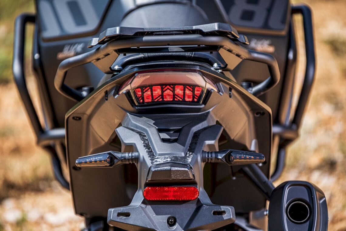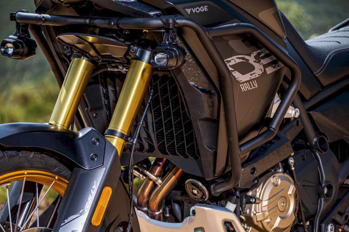 El depósito de gasolina alberga 24 l. y también dispone de doble toma de corriente USB (A+C, junto a la instrumentación), parabrisas regulable en altura (con herramientas), deflectores, manetas regulables, caballete central, puños/asiento calefactables, parrilla trasera portabultos con asideros de pasajero integrados, estriberas dentadas anchas (goma desmontable), palancas de cambio/freno articuladas, manillar regulable (4 posiciones, 3 cm), protecciones (cubrecárter de aluminio en una pieza -3 mm de espesor-, cubremanetas, defensas de carrocería -triple apoyo-, escape, bomba trasera, radiador y embrague, placas de nailon en el depósito), retrovisores abatibles y guardabarros delantero con altura regulable. VOGE declara 204 kg en vacío.