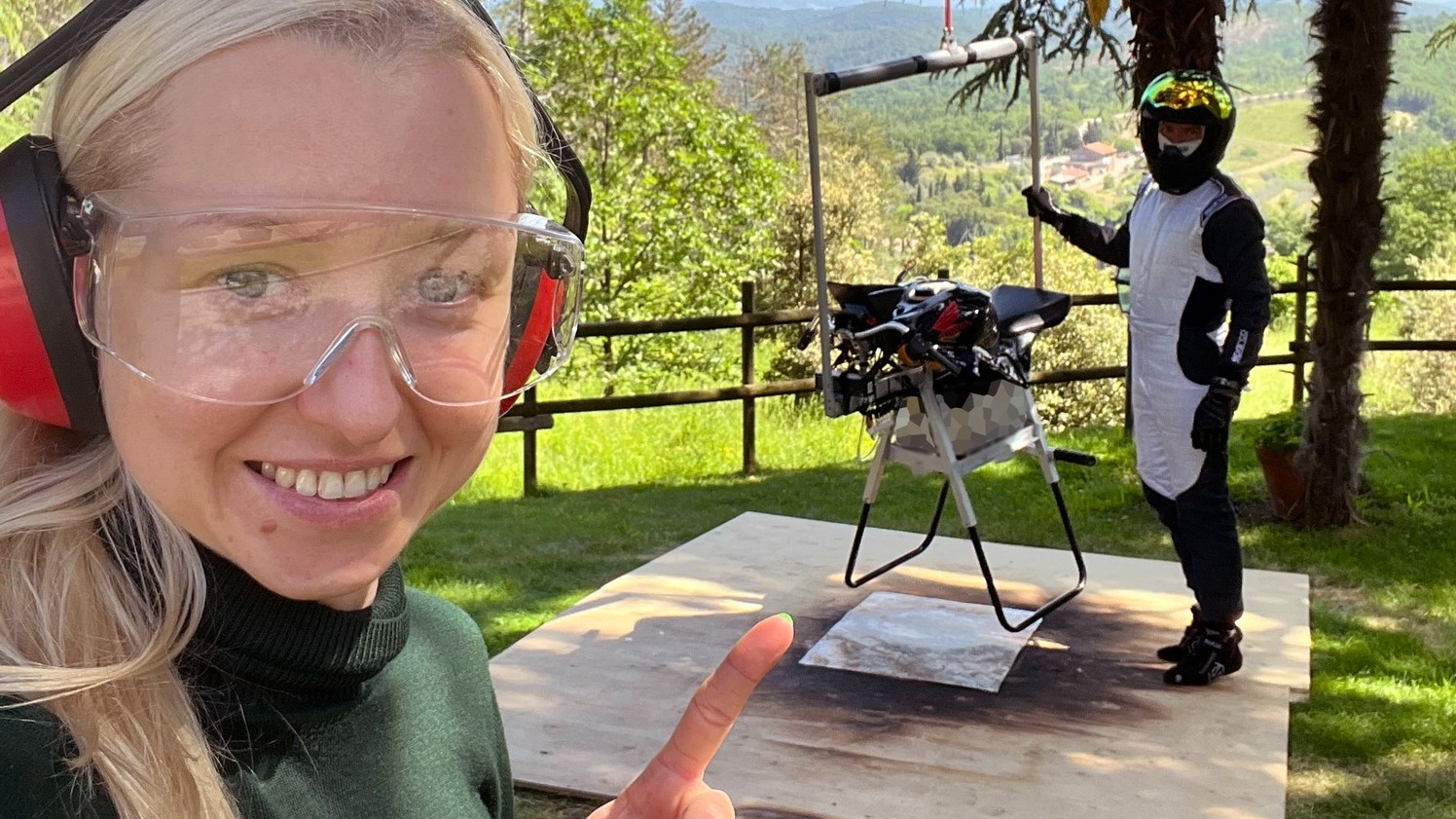 Para lograr ese peso pluma, Patan ha tirado de fibra de carbono y piezas hechas con impresora 3D. Nada de lujos: un solo asiento, sin carenados y sin cockpit. En su lugar, la información de vuelo aparece directamente en el casco del piloto a través de un display conectado por Bluetooth. La postura de conducción y el manillar recuerdan claramente a una moto, aunque a una que ha decidido dejar el asfalto para irse volando.