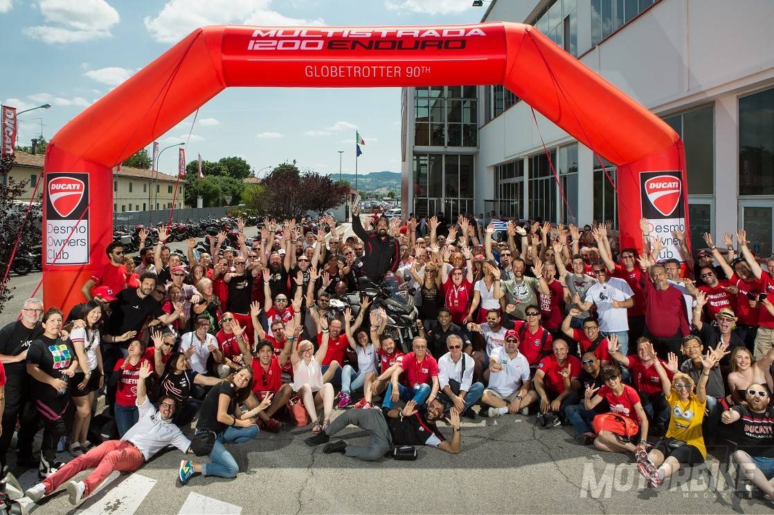 Tras el éxito del World Ducati Week 2016 celebrado el pasado fin de semana con 81.000 asistentes, en la vuelta a casa, los empleados de la fábrica portaron unas camisetas rojas conmemorando el 90º aniversario y compartieron una tarta el 4 de julio, día concreto en el que se celebra la onomástica, y aprovecharon para despedir al primero de estos siete moteros que porta la antorcha del "Globetrotter 90".