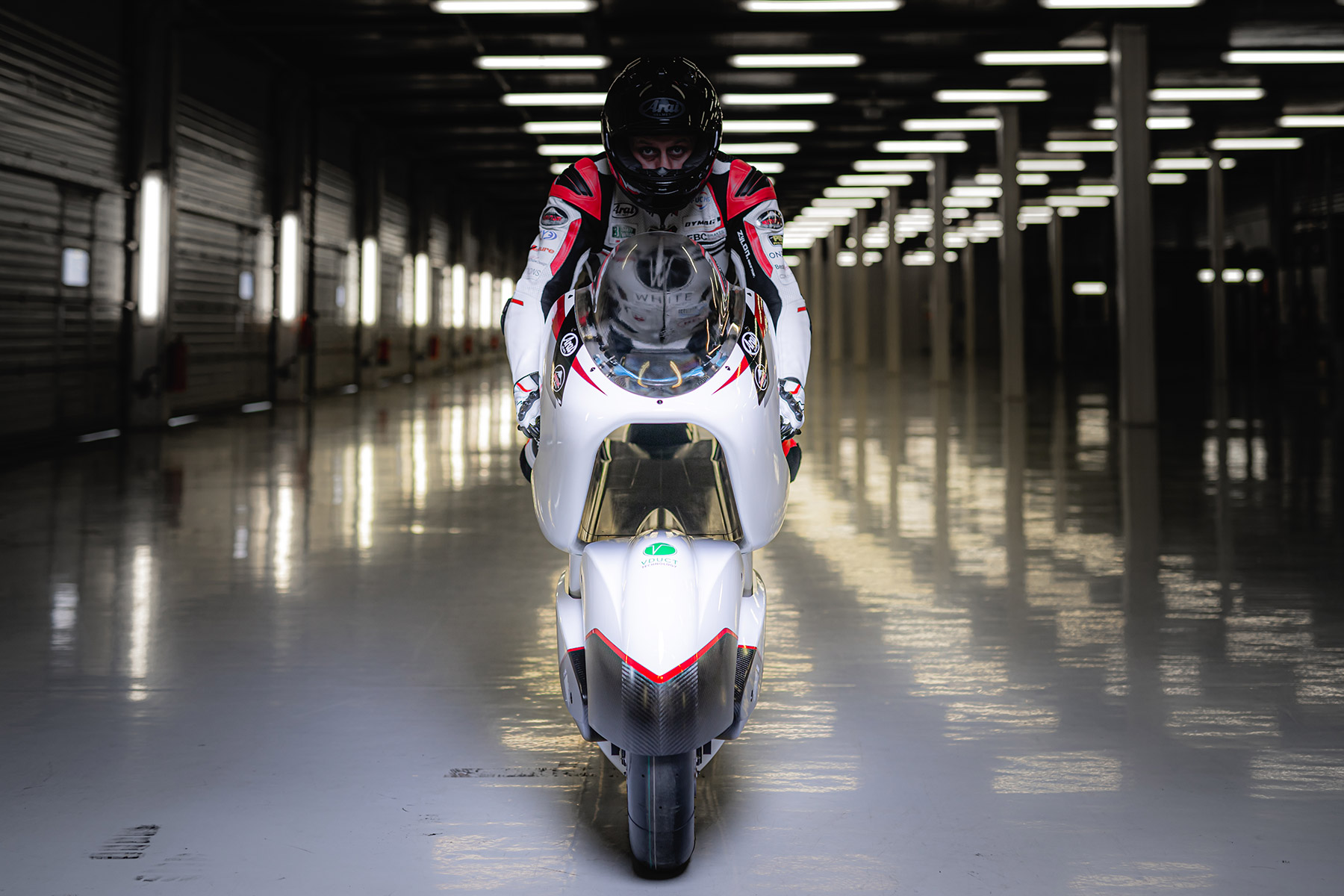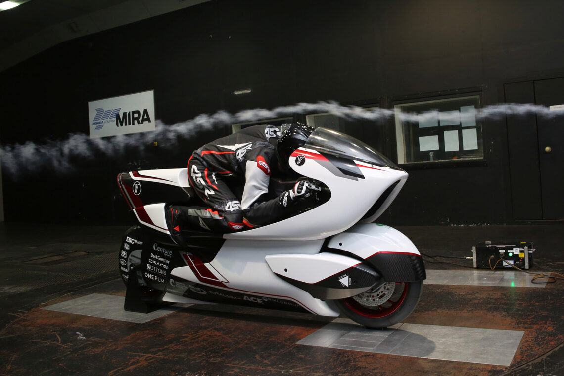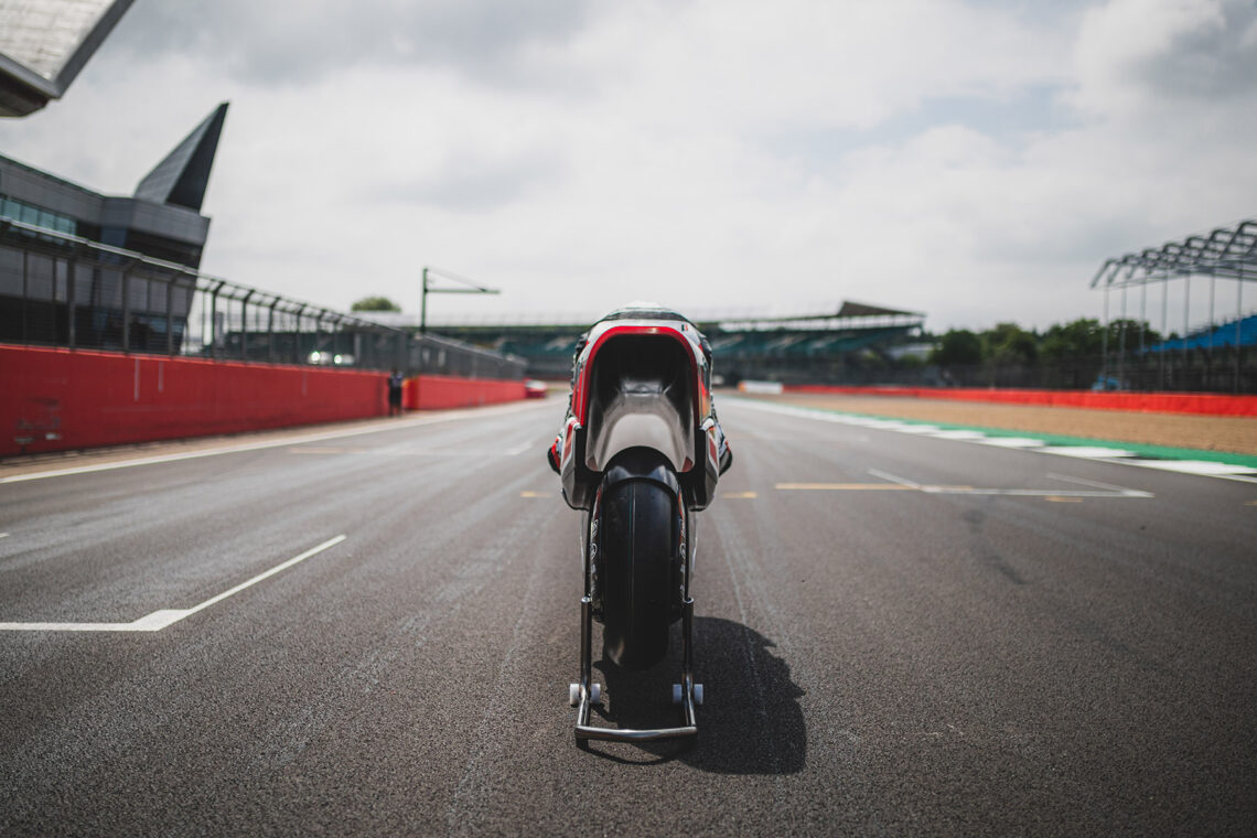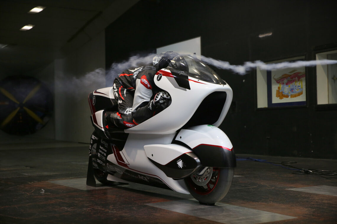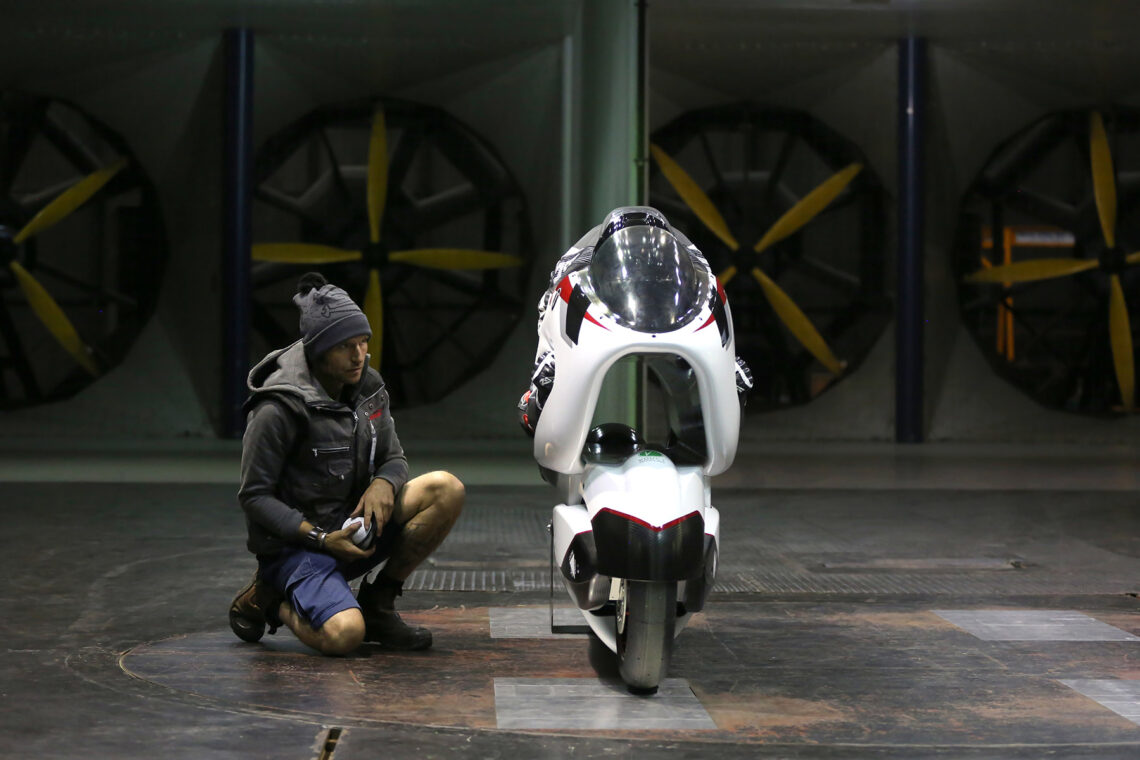 Llama mucho la atención su ergonomía, sus formas o su aerodinámica. La posición de pilotaje, lejos de estar muy bajo, mantiene una posición bastante convencional. Sin embargo, justo por debajo cuenta con un conducto totalmente hueco denominado V-Air que atraviesa la moto de morro a colín. Las pruebas realizadas en simuladores y el túnel de viento reflejan que este diseño tan particular reduce la resistencia al viento un 70% comparado con la moto de calle más aerodinámica del momento.