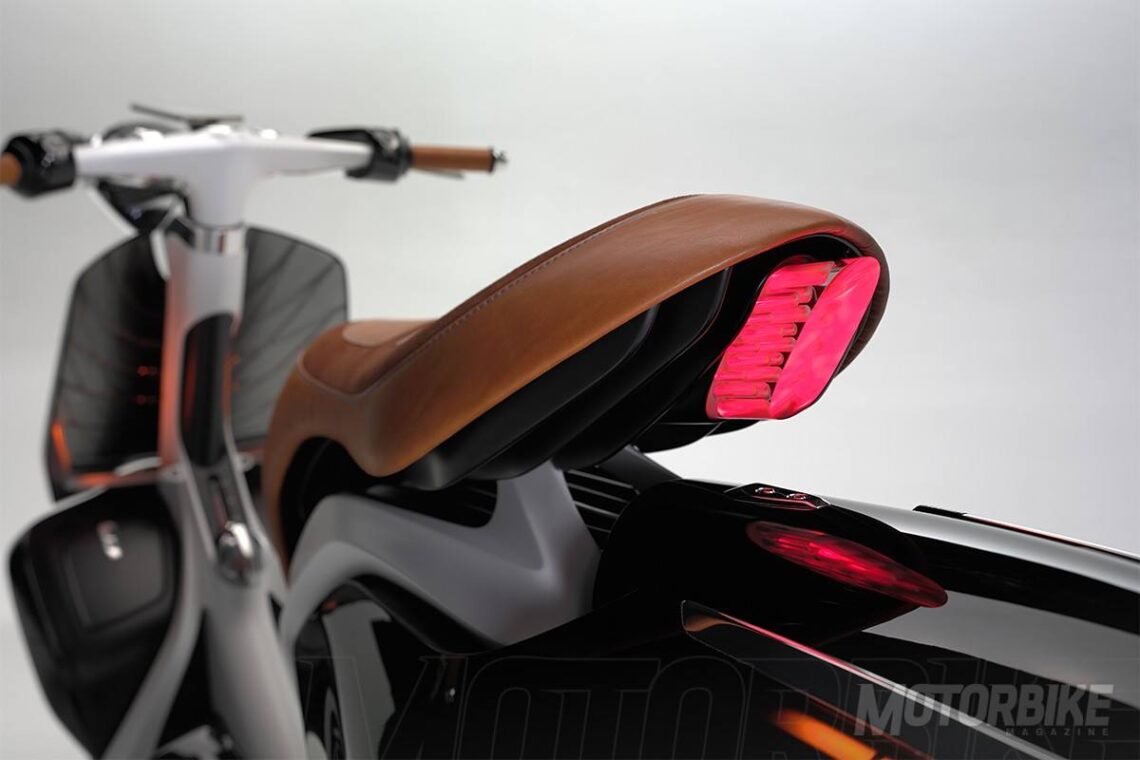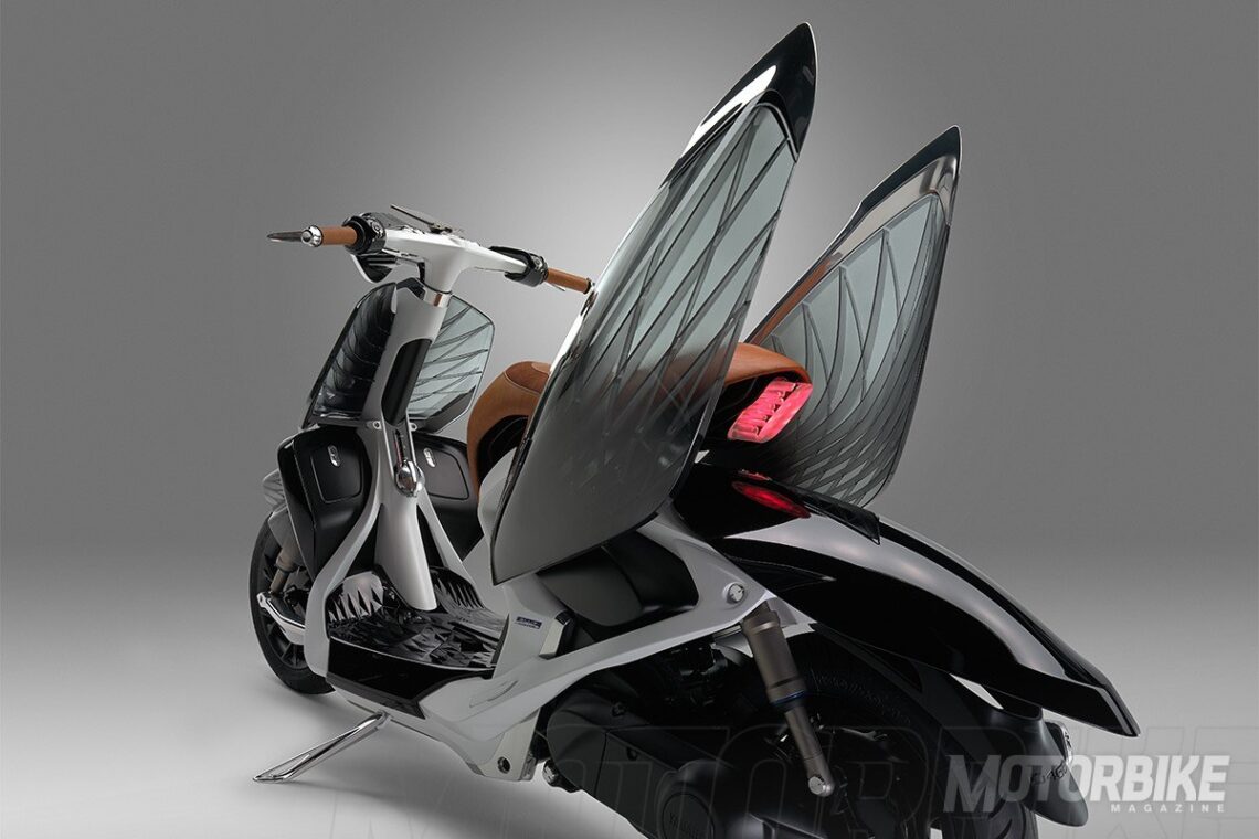 Si lo comparamos con un scooter tradicional, el Yamaha 04GEN sólo esconde el chasis tras unas estructuras semi-transparentes. De esta manera, podemos ver el interior quedando un aspecto exterior muy ligero. Incluso levanta parte de su carenado lateral recordando a las puertas de tijera de un Lamborghini.
