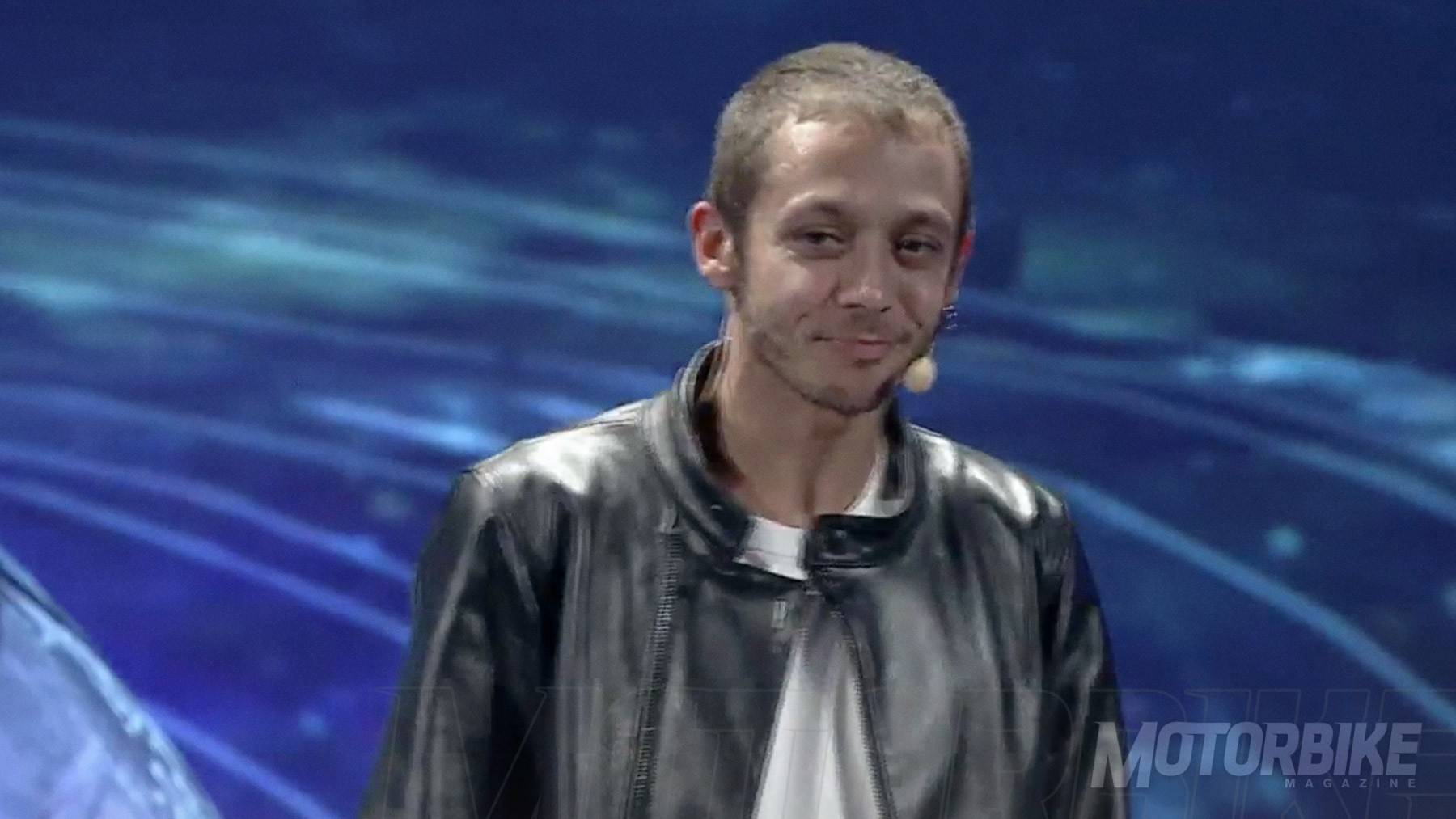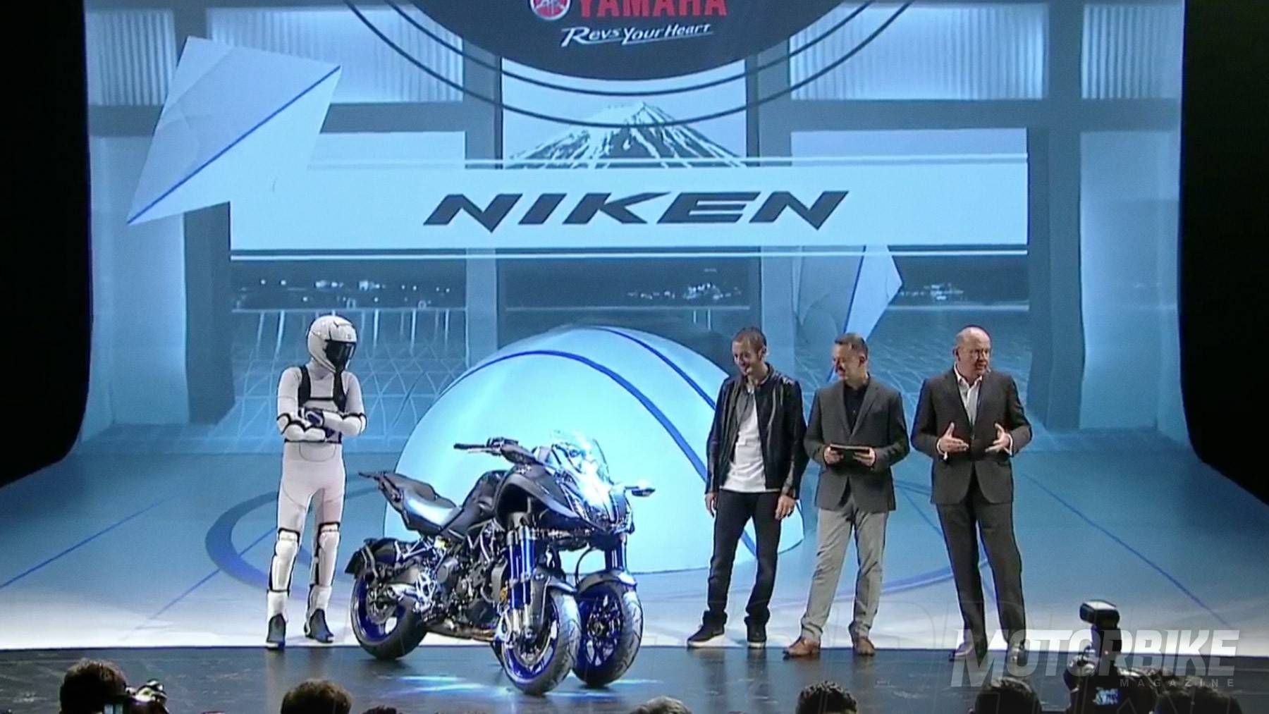 ¡Y sale al escenario Valentino Rossi! Pocos embajadores de Yamaha mejores que él, desde luego... «Estoy orgulloso de presentaros un nuevo "animal"», comenta. Parece que llega el turno de la Yamaha Niken...