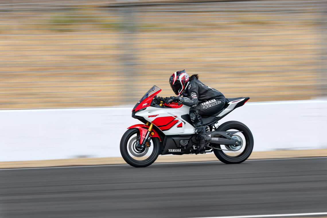 En 2026, los modelos R125, R3, la nueva R7 y la R9 llegarán con esta decoración especial que combina el blanco perlado “Qualitative Pearlish White” con detalles en rojo y negro, además de los característicos gráficos speedblock. Cada modelo incorporará un logotipo con estética de los años 90 y el icónico diapasón dorado, como en las motos oficiales de Factory Racing.