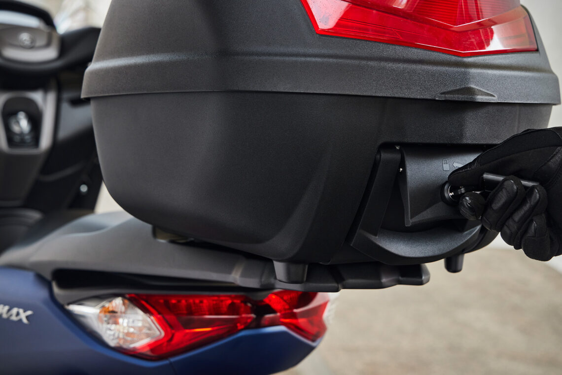 Esta NMAX 125, al igual que sus hermanas de mayor cilindrada, incorpora el sistema de apertura sin llave “Smartkey”. Con este sistema podemos desbloquear, encender la moto o hasta abrir el asiento o el tapón de gasolina. Todo ello, sin necesidad de ninguna llave y simplemente girando el conmutador o los botones situados en la columna central, justo debajo del manillar.