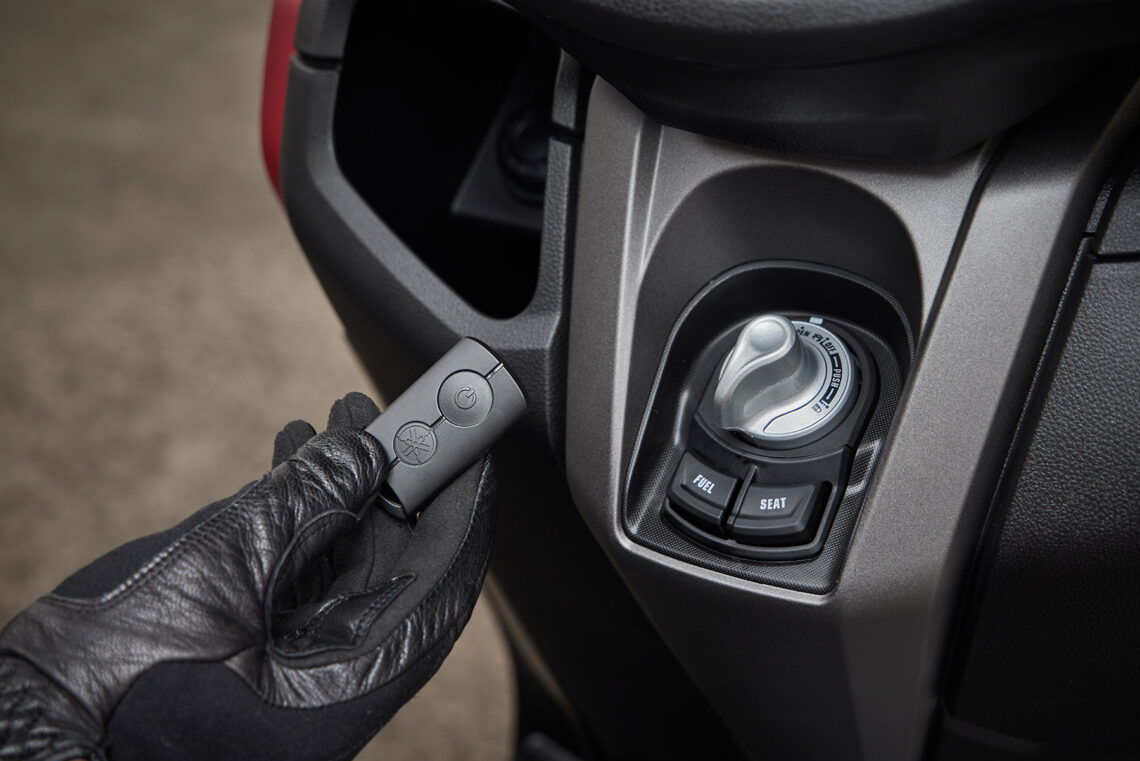 Arrancar el NMAX 125 es tan fácil como acercarte a él con el Smartkey (apertura inalámbrica sin llave) que viene de serie, y girar el conmutador que tenemos justo en la columna de dirección, por debajo del manillar. Con este conmutador podemos desbloquear el manillar, arrancar la moto y justo al lado encontrar dos pulsadores para abrir tanto el tapón de gasolina como el asiento. Todo esto, sin necesidad de llave…