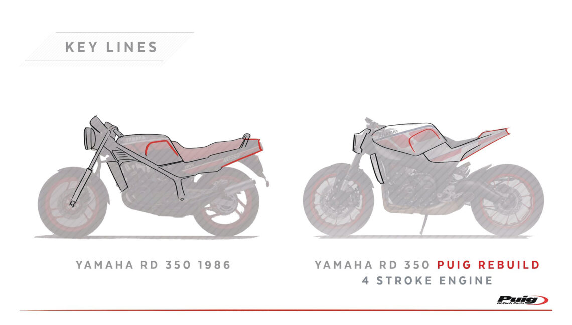 Desde el departamento de diseño de la marca española de componentes de motos Puig han recreado una Yamaha RD 350 actual, basándose en el mítico modelo de los años 80, respetando sus líneas gráficas pero, con un diseño propio de la actualidad. Además, y aunque para muchos suponga un sacrilegio, Puig la ha dotado de un motor de 4T en su prototipo de ordenador, actualizando de ese modo no solo su estética si no también su mecánica.
