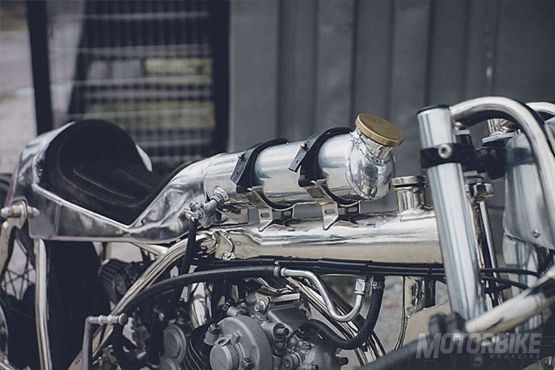 Volvemos con la pintura, que aunque parece que haya sido muy intenso ha sido sólo en el chasis. El resto ha sido trabajo de pulido a mano. ¡Cuántas horas habrán pasado puliendo! Echa un vistazo al tambor del freno trasero o las cubiertas del motor. El asiento monoplaza con colín también es nuevo, como el nuevo cuerpo. Los ojos se nos van al depósito de gasolina, restaurado y agarrado con dos cintas de cuero y con una tapa retro. El depósito se une con las mismas líneas a la pieza del asiento.