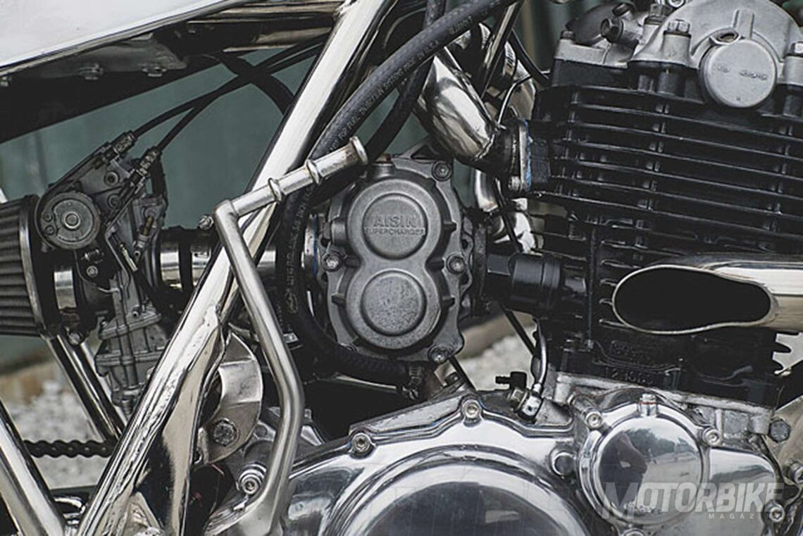 Sin embargo, hubo que hacerle primero una limpieza en profundidad, ya que había participado en carreras en la playa, por lo que habría arenilla por todas partes. El motor de 400 cc fue levemente revisado aunque lo que más destaca es el sistema de sobrealimentación Aisin AMR300 que le da un plus de prestaciones. Otros componentes internos también son de mejor calidad para resistir el envite del 'turbo' o el escape, ahora casi en 'escape libre'. Dentro han fabricado un árbol de levas propio con especificaciones muy concretas. Con un nuevo filtro, bastó para volver a instalar el bloque en el chasis.