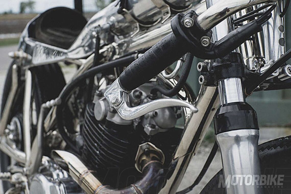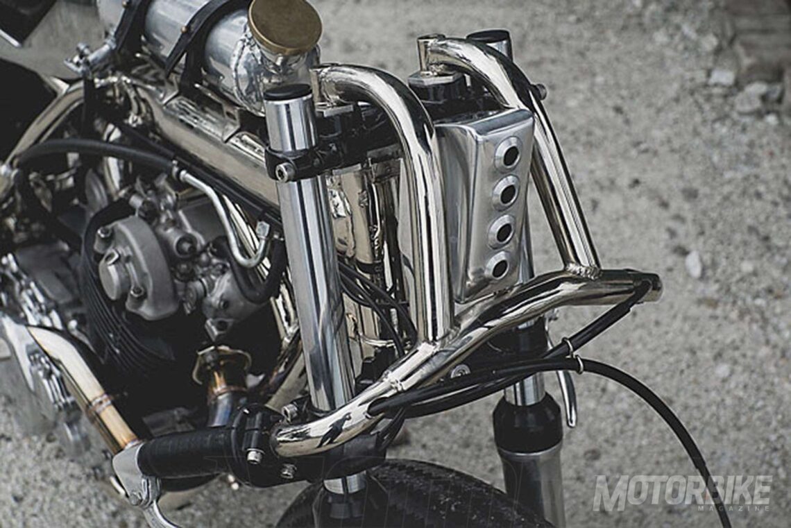 Otra de las peculiaridades que le dan esa personalidad de carreras antiguas son los manillares. Las barras han sido una vez más personalizadas por Beautiful Machines. Cada barra empieza en la cabeza de los tubos de la horquilla girando hacia delante y hacia abajo. Ahí se unen con otra barra curva, el manillar propiamente dicho, justo por encima de la rueda delantera. Termina con las levas invertidas. Increíble trabajo.