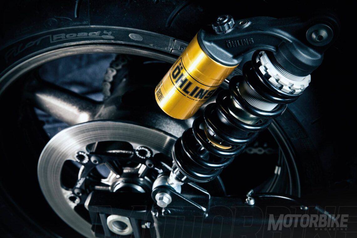 Los frenos están encomendados a un sistema completo Beringer compuesto por una bomba y sendas pinzas que muerden discos Hypersport. Para la suspensión trasera se han elegido amortiguadores Öhlins STX 36 y se ha fabricado un sistema de escape 4 en 2 en colaboración con la firma Spark.