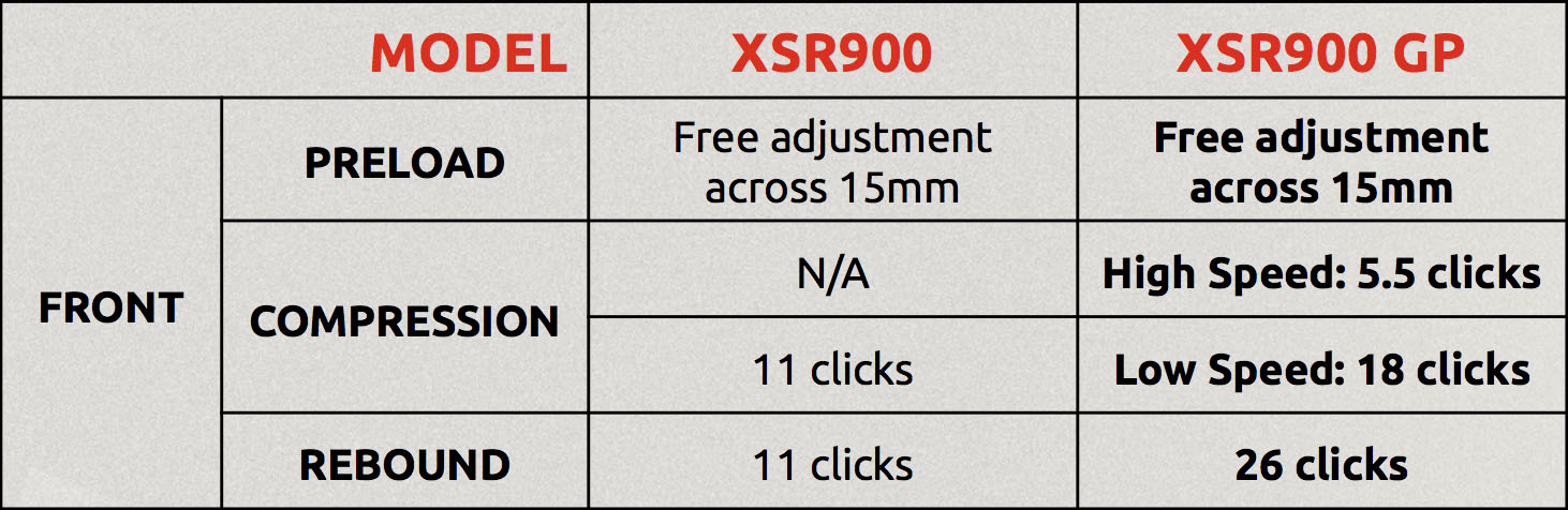 Lo primero que diferencia la XSR900 GP de la XSR900 estándar es la parte ciclo. Más allá de los frenos, donde no hay diferencia, ahora las suspensiones son el tope de gama de la marca KYB, encontrando por ejemplo no solo un mejor rendimiento sino una capacidad de regulación de hidráulico tanto en alta como baja velocidad durante la fase de compresión. Esto se da tanto en la horquilla delantera como en el monoamortiguador trasero. Por supuesto también son regulables en precarga.