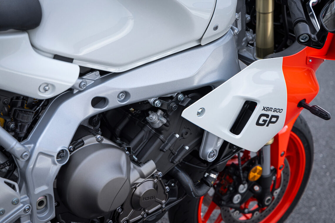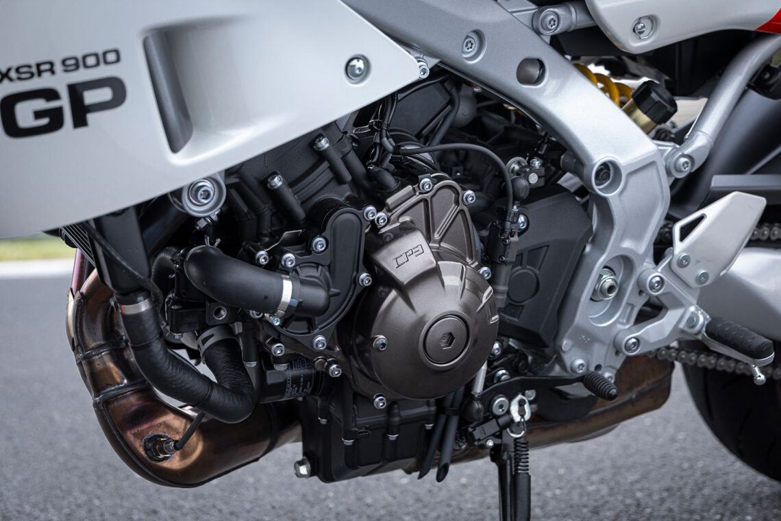 El motor de la XSR900 GP se ve inalterado respecto la XSR900, con sus 119 cv de potencia, 93 nm de par motor, Euro5+, y sus 5L/100km de consumo homologado. Sin embargo, si encontramos una pequeña y sutil diferencia en la transmisión, siendo nuevos los piñones 3, 4, 5 y 6, con un cambio en el estriado para mejorar la suavidad de rodadura y de transición de cambio.