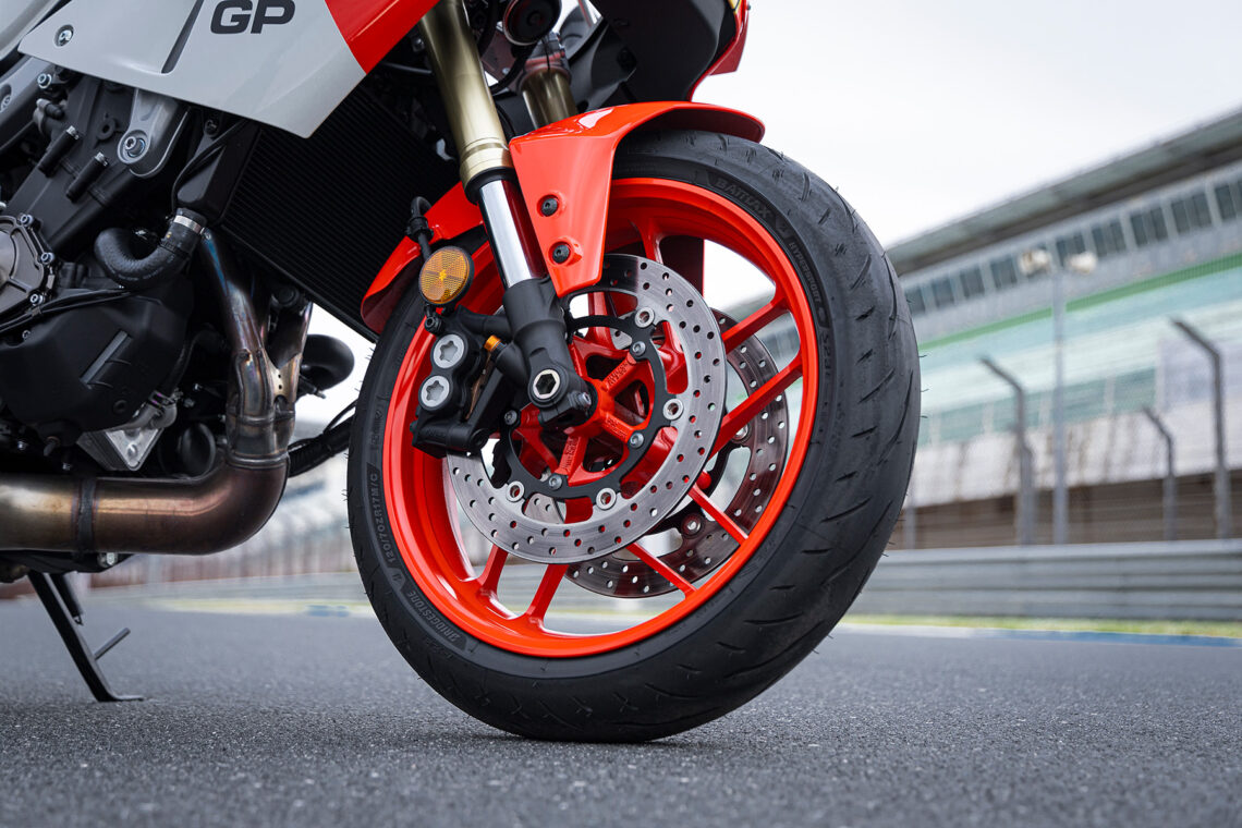 Otro detalle que me ha gustado bastante, por encima de la XSR900 y por supuesto de la Mt-09 es la frenada. ¿Frena mal la MT-09 ó la XSR900? Ni de coña, de hecho frenan muchísimo y muy bien, pero el punto de apoyo del piloto es más alto, y por ende se crea "cierta palanca" cuando la frenada es muy fuerte sobre la horquilla delantera. En verdad queda compensada por la propia inercia de la moto en general, pero no deja de dar una sensación de "altura" que la GP no tiene. La XSR900 GP al ser proporcionalmente más bajita —ya que es más larga— su punto de "anclaje" y por tanto "de apoyo" en una frenada fuerte es más bajo, minimizando no solo la transferencia de pesos ante misma potencia de frenada, sino también esa sensación de altura. En otras palabras, las sensaciones de frenada son como las de una RR, más sólidas de tren delantero y por tanto más capaces de forzar una entrada a curva apurada.